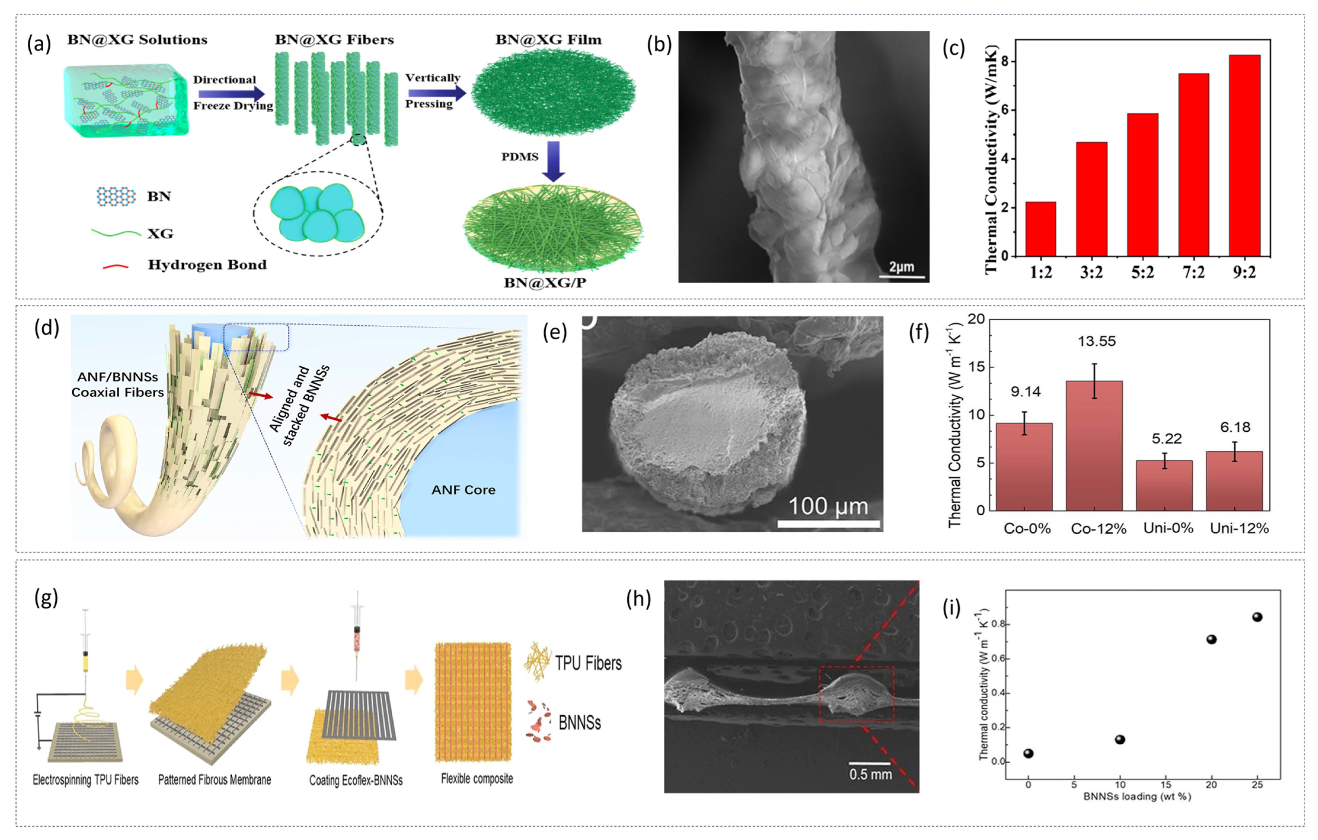 - Lu, W.; Deng, Q.; Liu, M.; Ding, B.; Xiong, Z.; Qiu, L. Coaxial wet spinning of boron nitride nanosheet-based composite fibers with enhanced thermal conductivity and mechanical strength. Nano-Micro Lett. 2024, 16, 25. [Google Scholar] [CrossRef]