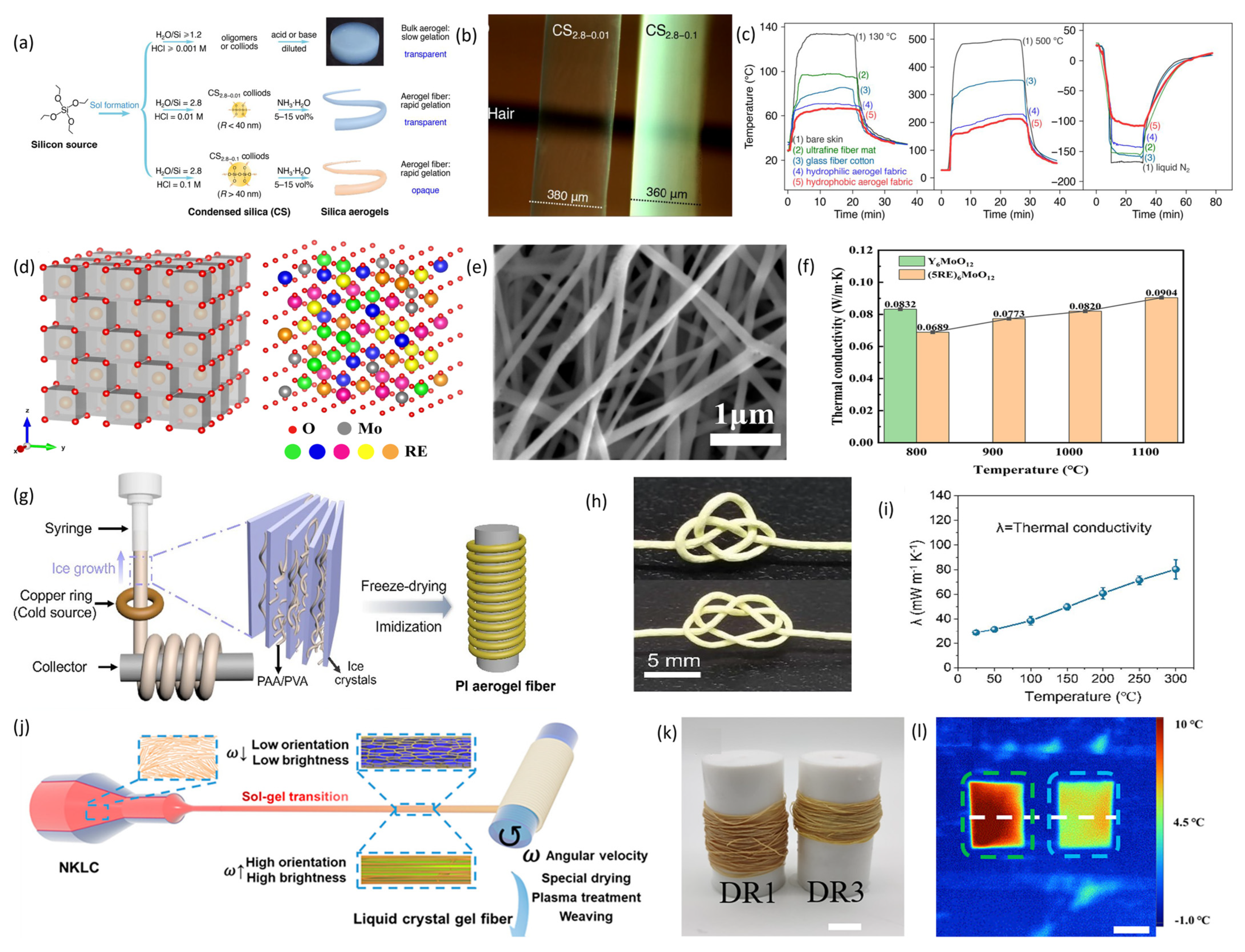 | NKLC Aerogel Fibers | NKLC | 120 | 0.037 | Liquid Crystal Spinning, Freeze Drying | Hot and Cold Plate Test | [76] |