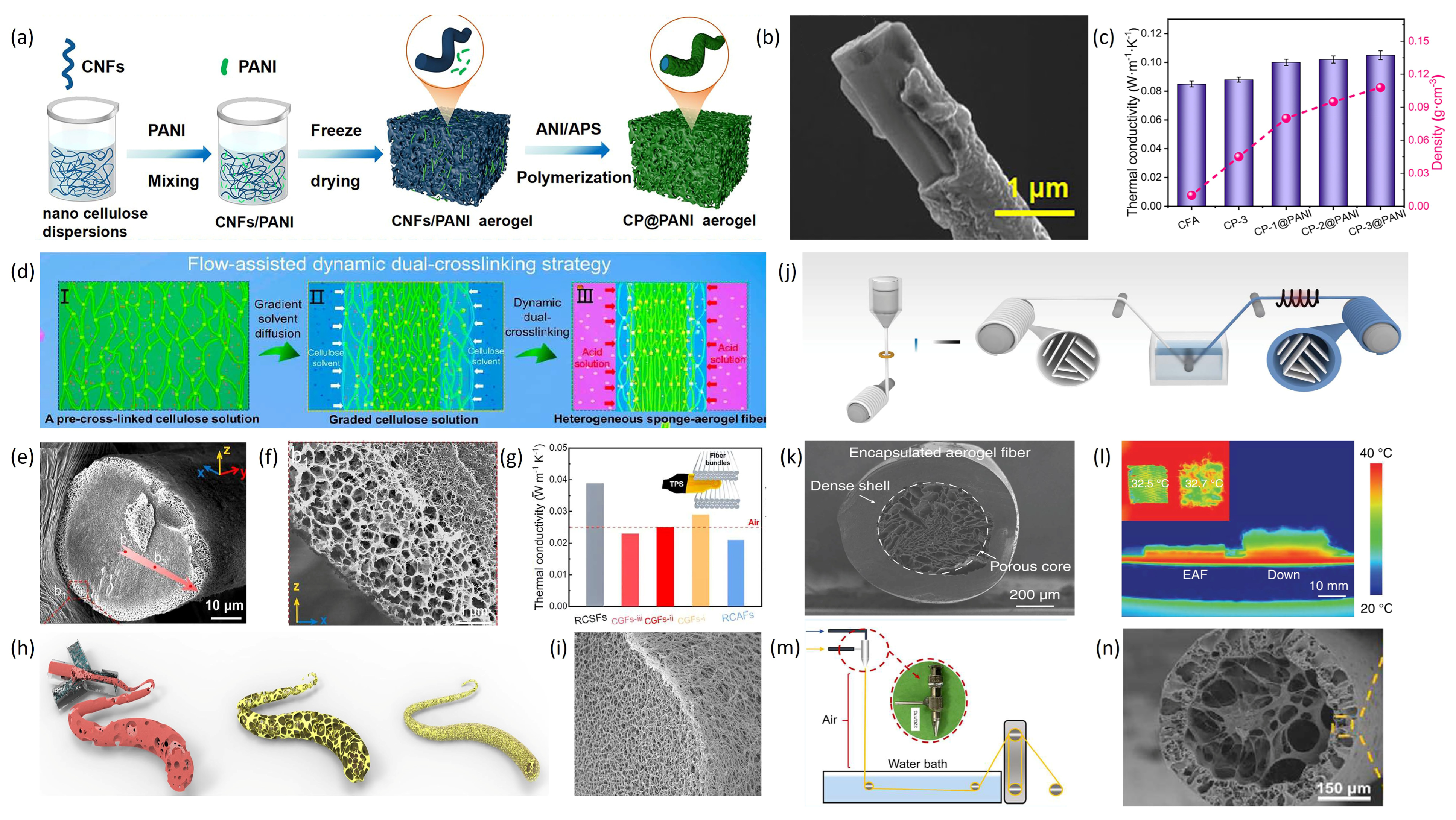 | All-cellulose fractionated sponge aerogel fibers (CGF) | Cellulose | 48 | 0.023 | Flow-assisted dynamic dual-crosslinking strategy | a setup including the transient plane sensor (TPS) | [78] |