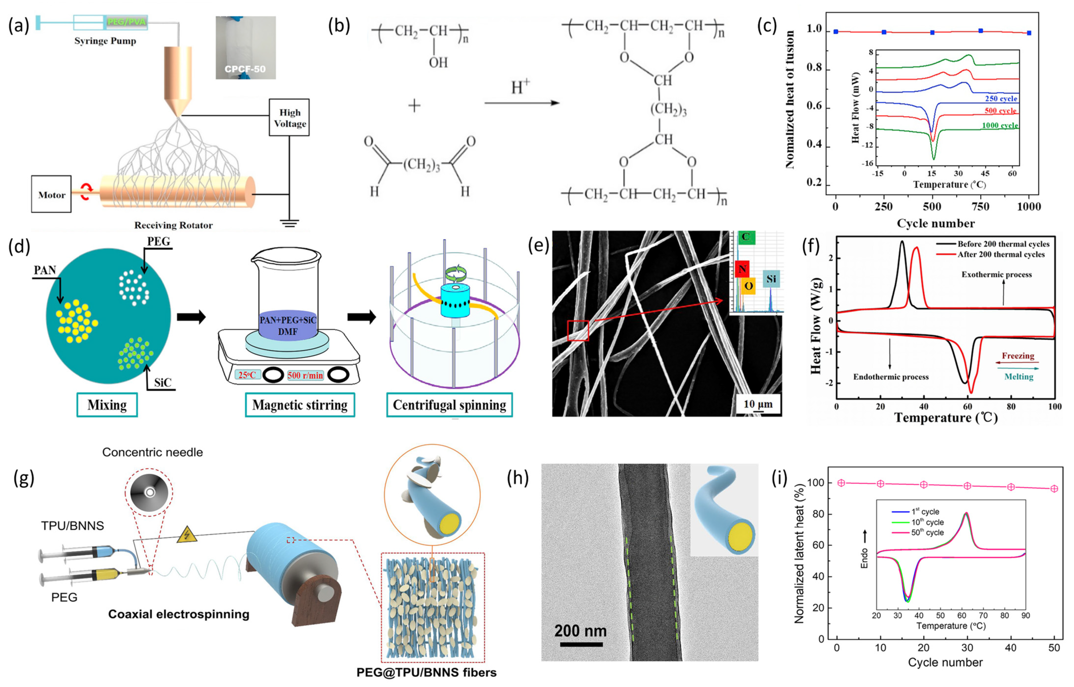 | PAN/PEG/SiC PCM fibers | PEG | Centrifugal Spinning | 69.91 | 51.31 | 33.71 | [131] |