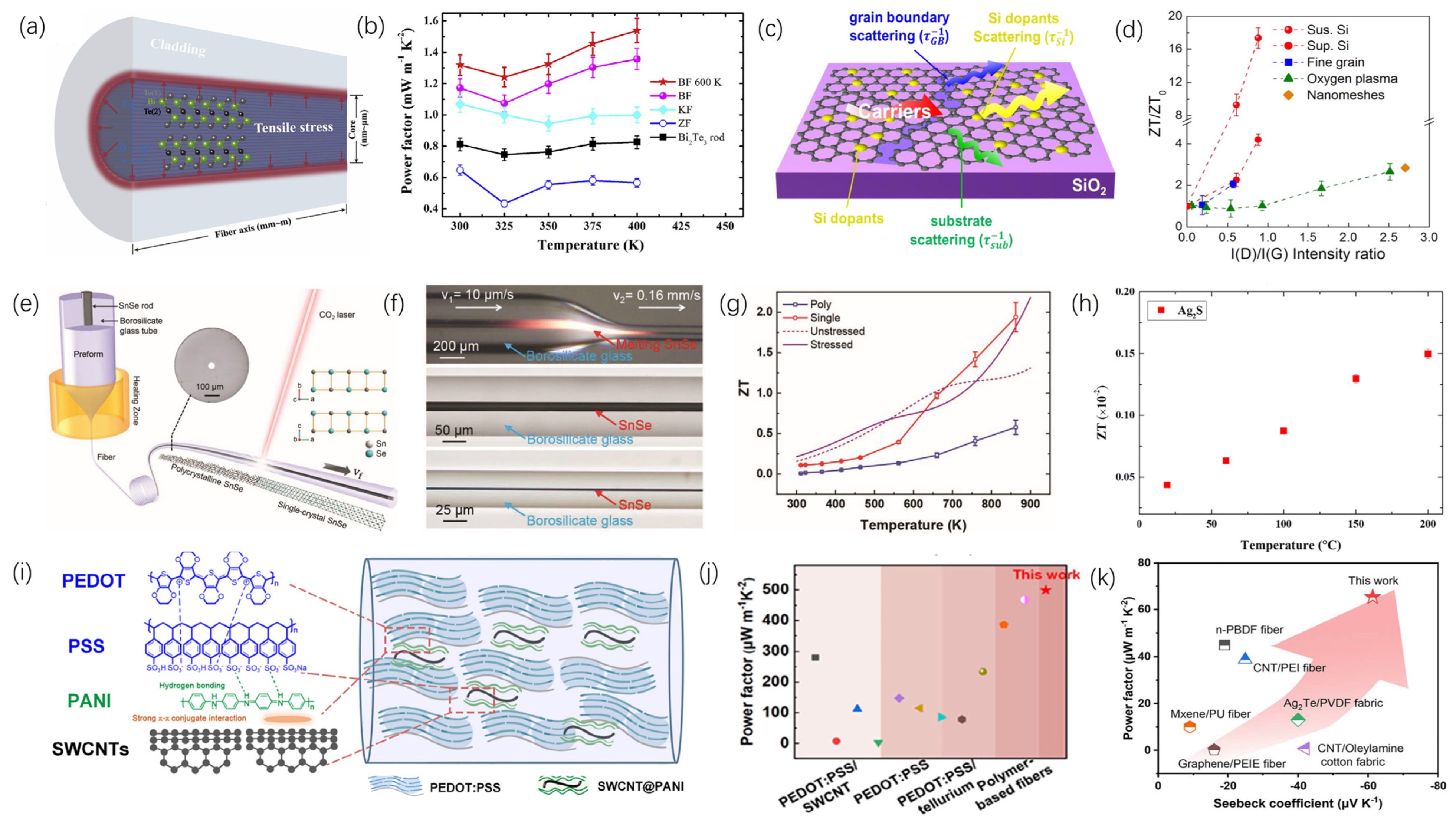 | Single-crystal SnSe core fibers | thermal drawing technology | 862 K | ~310 | 5500 | 0.22 | 528.55 | 1.94 | [158] |