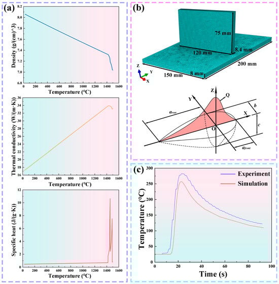 Models and parameters utilized in the simulation: (a) thermal–physical properties of materials; (b) mesh model and double-ellipsoidal heat source; (c) validation results of the finite element model.