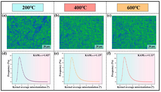 To further characterize the dislocation density of samples prepared at different interlayer temperatures, EBSD analysis was conducted (Figure 6). Figure 6a–c present the distribution maps of the average kernel average misorientation (KAM) obtained from the EBSD. Since the KAM value is positively correlated with the local lattice distortion, these maps provide an intuitive representation of the spatial distribution of dislocations. The analysis indicates that the sample processed at an interlayer temperature of 200 °C exhibits a relatively low dislocation density across the observed region. In contrast, samples fabricated at interlayer temperatures of 400 °C and 600 °C show significantly higher dislocation densities. This trend is quantitatively corroborated by the average KAM values shown in Figure 6d–f, where the sample at 200 °C exhibits the lowest average KAM value of 1.02°, whereas samples processed at 400 °C and 600 °C display higher values of 1.15° and 1.11°, respectively. Notably, the sample treated at 400 °C shows the most pronounced increase. These results demonstrate that variations in interlayer temperature induce different thermal cycling histories during fabrication, leading to substantial differences in dislocation density. High-density dislocations act as effective barriers to dislocation motion and the initiation of plastic deformation, thereby significantly impeding dislocation mobility.