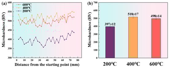 Hardness distribution profiles of specimens deposited at interlayer temperatures of 200 °C, 400 °C, and 600 °C: (a) hardness profile along the build direction; (b) average hardness bar chart.