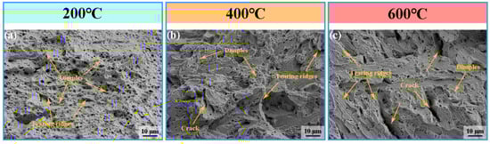Figure 12 presents the SEM images of the tensile fracture surfaces of specimens fabricated at different interlayer temperatures (200 °C, 400 °C, and 600 °C). At 200 °C (Figure 12a), the specimen exhibits pronounced necking, with the fracture surface predominantly composed of numerous dimples and a few tearing ridges, indicating a primarily ductile fracture. This observation is consistent with the high EL reported in Figure 11. When the interlayer temperature is increased to 400 °C (Figure 12b), the fracture morphology evolves into a mixed mode, characterized by a reduction in dimples, an increase in tearing ridges, and the appearance of minor cracks. At 600 °C (Figure 12c), the fracture morphology undergoes a substantial transformation: dimples are largely suppressed, while tearing ridges and cracks become more prominent, indicating a transition toward a predominantly brittle fracture mode. Correspondingly, compared to specimens deposited at 400 °C, the UTS decreases.