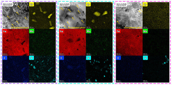 HAADF-STEM images and corresponding EDS mapping distributions of nanoscale precipitates within H13 steel specimens fabricated at different interlayer temperatures: (a) 200 °C; (b) 400 °C; (c) 600 °C.