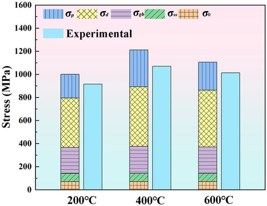 where k denotes the Hall–Petch constant for H13 steel (300 MPa μm1/2) [38], and d represents the average grain size. Since the martensite block size can be considered as the effective grain dimension [39], the average block sizes measured via EBSD in Section 4.1 were directly adopted. The samples fabricated at interlayer temperatures of 200 °C, 400 °C, and 600 °C exhibited average grain sizes of 1.77 μm, 1.64 μm, and 1.71 μm, respectively. The corresponding grain boundary strengthening contributions, σgb, were calculated as 226 MPa, 234 MPa, and 229 MPa.