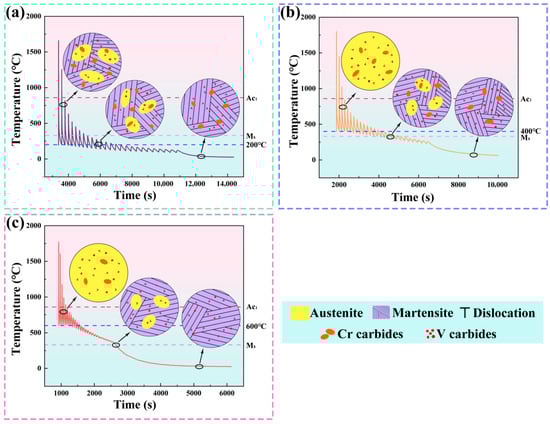 Simulated thermal cycling and corresponding microstructure evolution of H13 steel during WA-DED at different interlayer temperatures: (a) 200 °C; (b) 400 °C; (c) 600 °C.