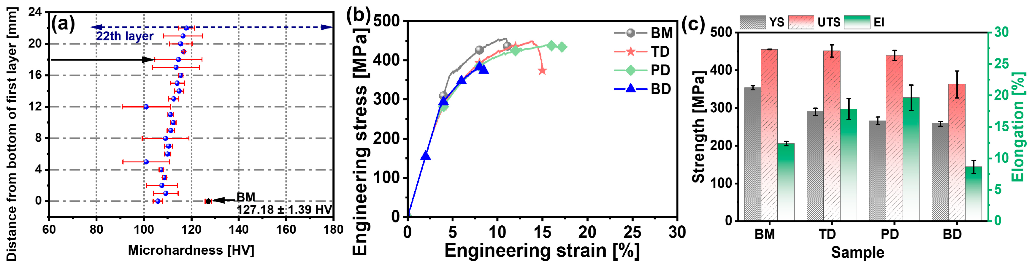 - The tensile strength and elongation of the as-deposited composite in the TD and PD were comparable to the BM. However, the mechanical properties were lower in the BD than in the TD and PD due to inferior interlayer bonding.