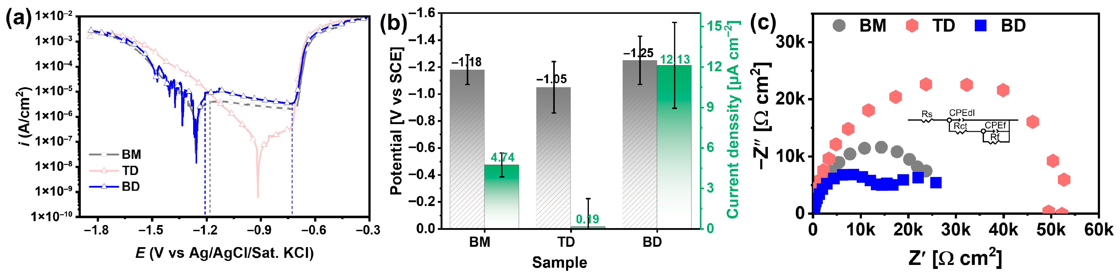 | Samples | RS (Ω·cm2) | Qf (10−5F/cm2·s−n) | nf | Rf (Ω·cm2) | Qdl (10−5F/cm2·s−n) | ndl | Rct (Ω·cm2) | RL (Ω·cm2) | L | Rf + Rct (Ω·cm2) |