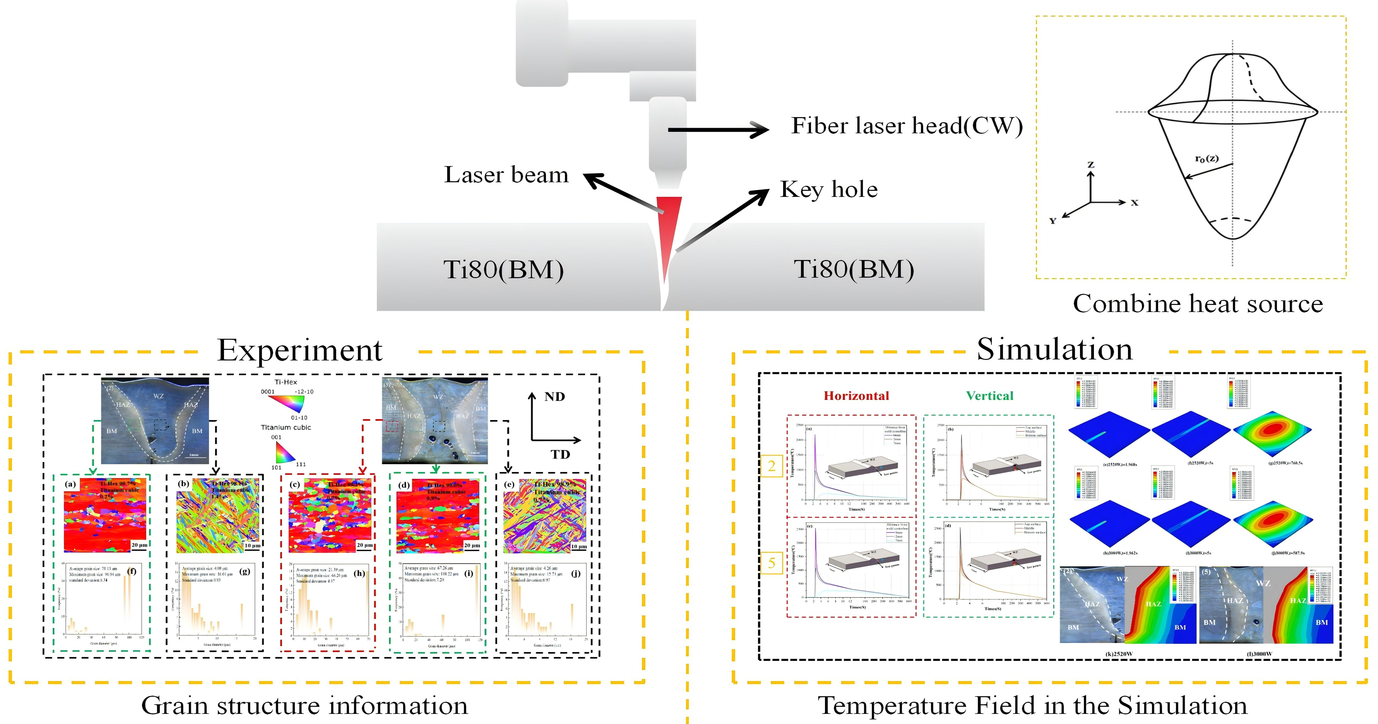 - In laser welding of Ti80 titanium alloy, the density of GND in the WZ is slightly higher than that in the HAZ. Increasing laser power not only reduces the recrystallization degree of WZ grains but also decreases GND density in WZ, and the Vickers hardness of the WZ first increases and then decreases. The average Vickers hardness of the WZ is approximately 420 HV to 460 HV, that of the HAZ is about 390 HV to 400 HV, and that of the BM is approximately 320 HV to 360 HV.