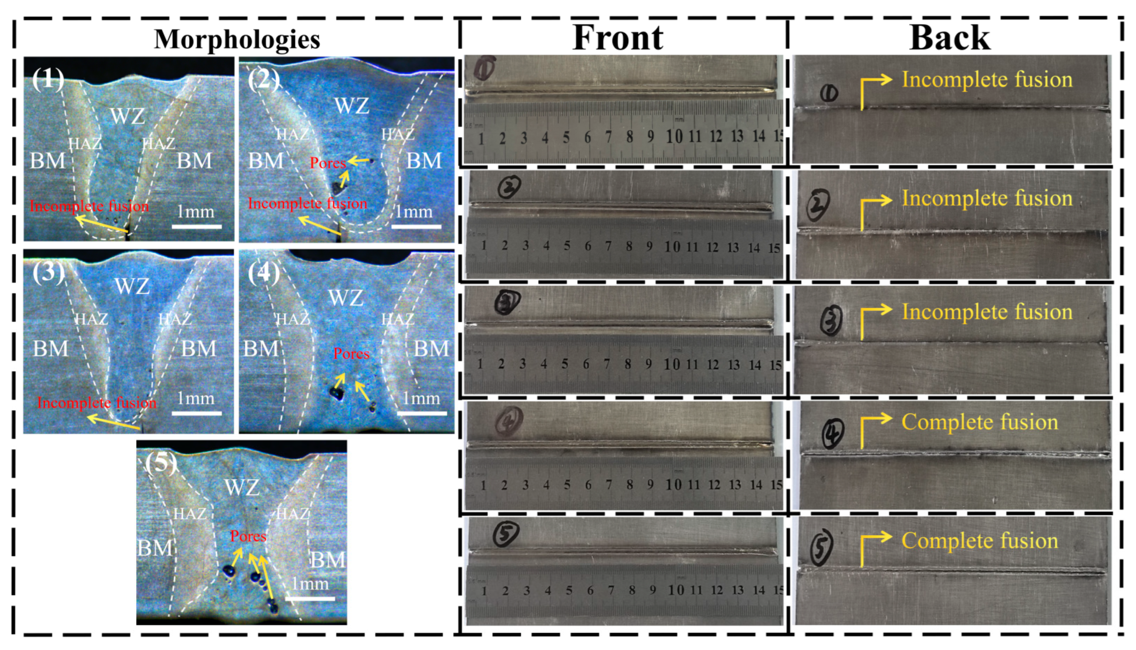 3.1. Effect of Laser Power on Weld Morphology