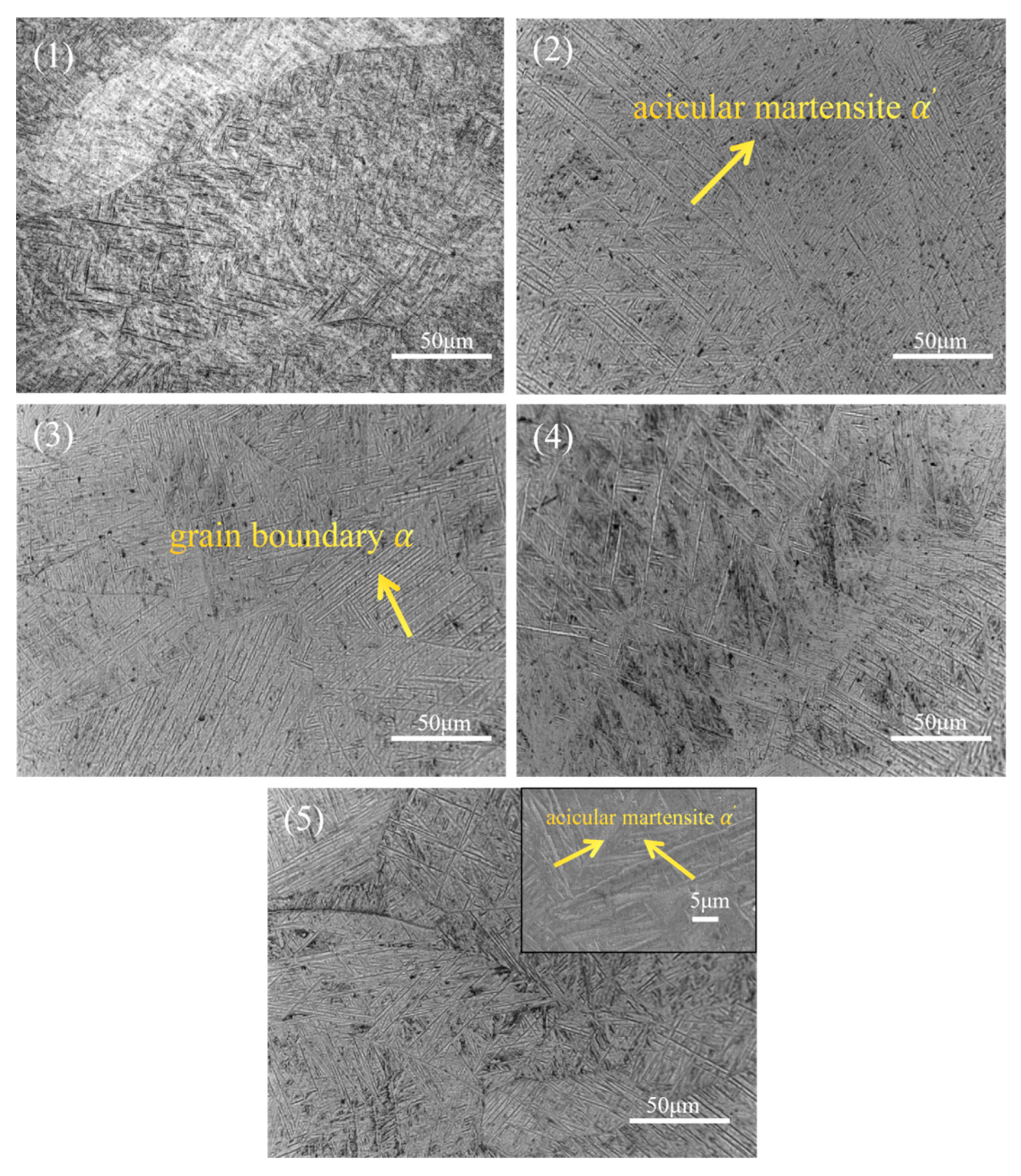 - Xiao, C.; Hu, B.; Ge, J.; Kong, B.; Luo, D.; Zhang, X.; Zhou, K. Revealing the Effect of α’Decomposition on Microstructure Evolution and Mechanical Properties in Ti80 Alloy. Materials 2024, 17, 2238. [Google Scholar] [CrossRef]