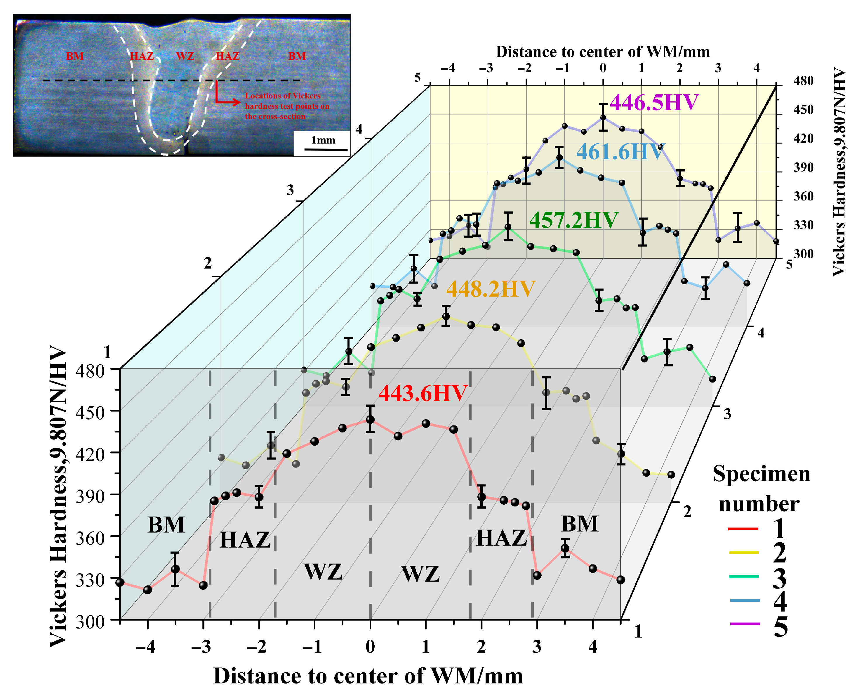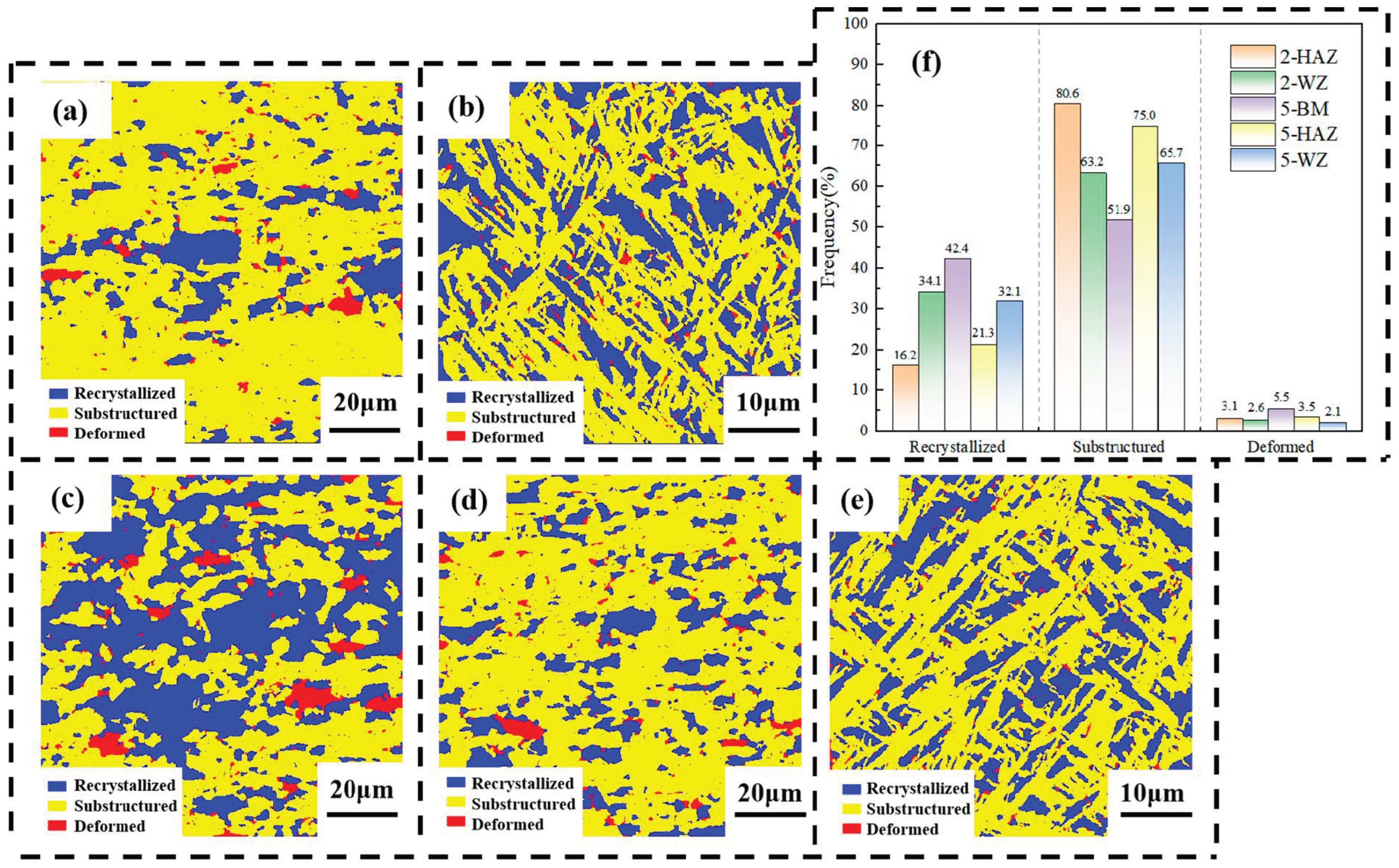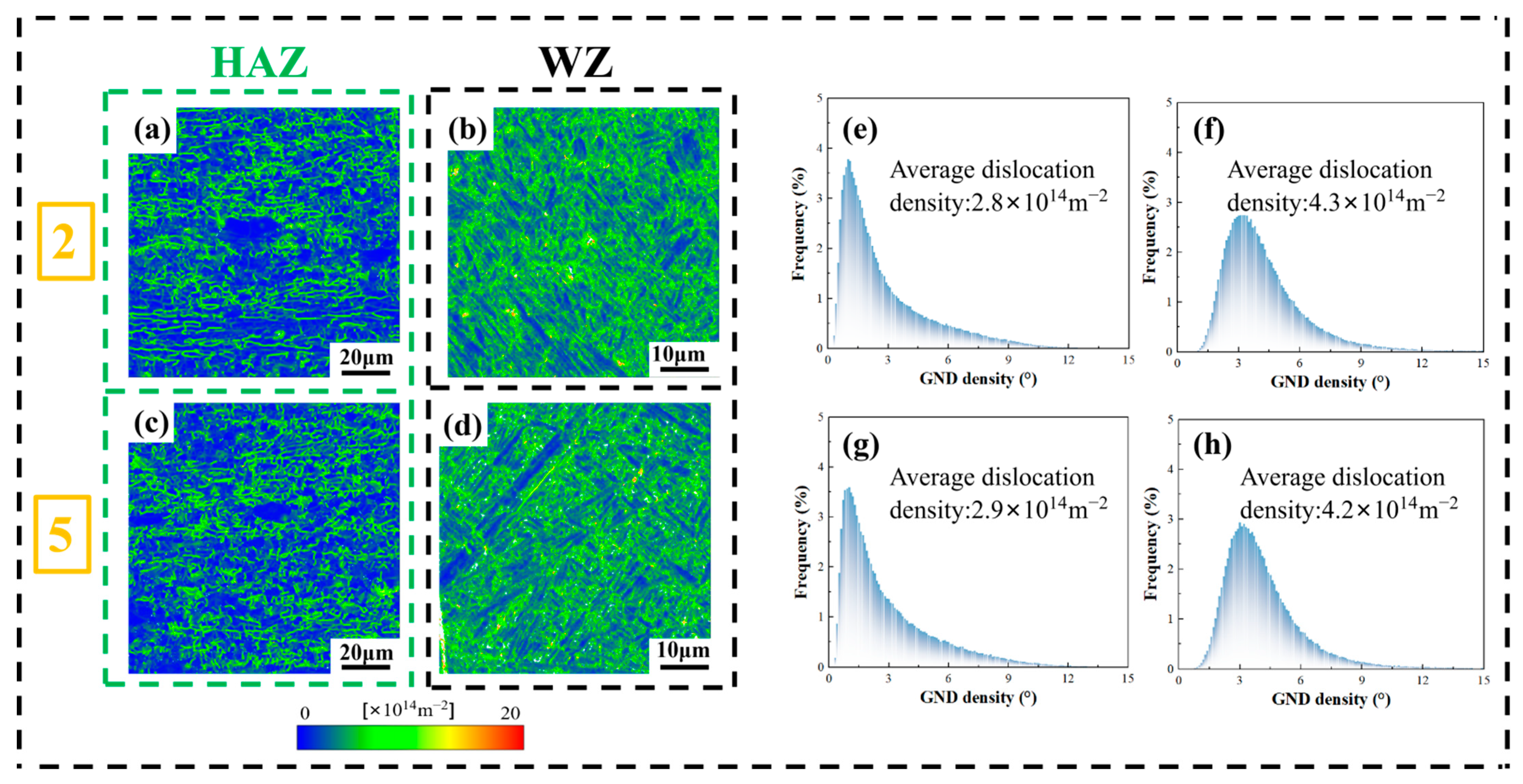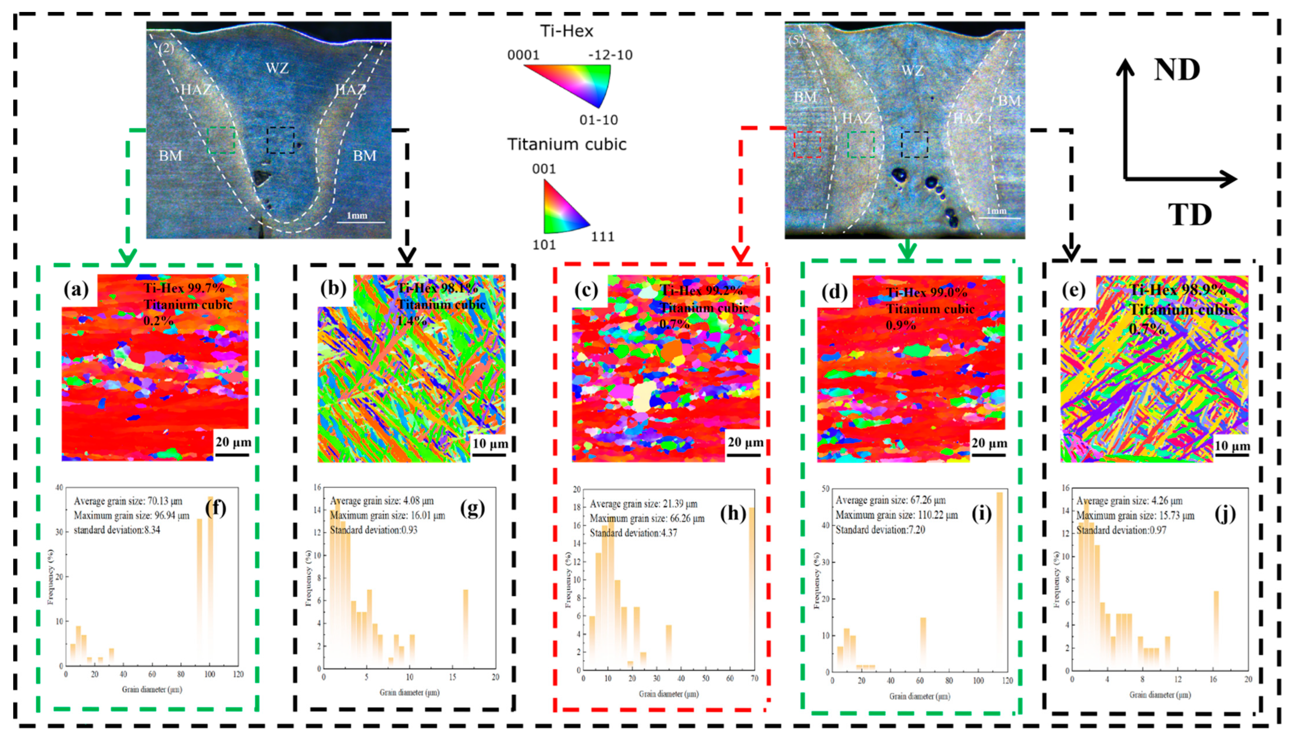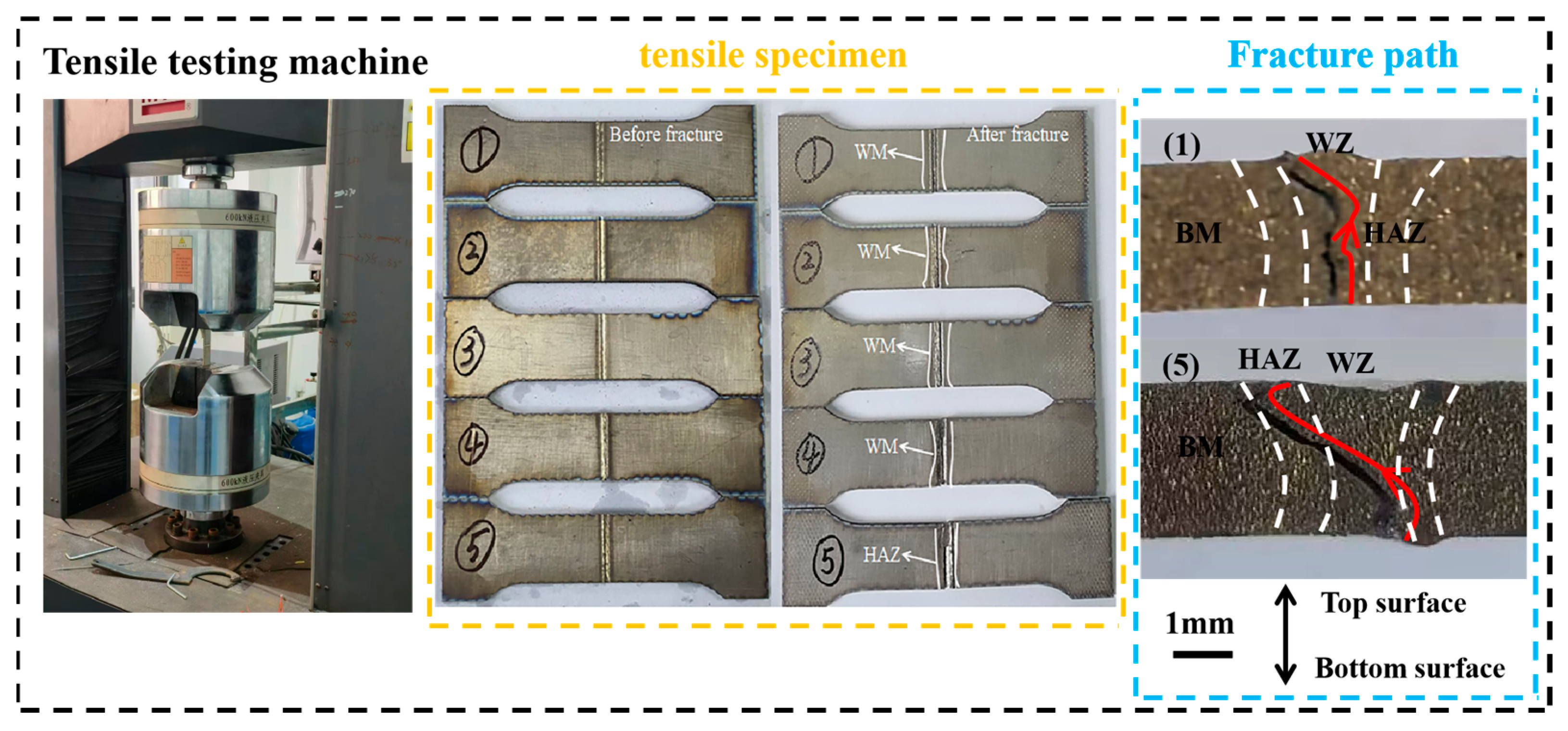 - All tensile specimens 1 to 4 started to fracture at the lower part of the WZ and the cracks ended at the upper part of the WZ. However, specimen 5 began to fracture in the HAZ and the crack ended at the upper part of the HAZ. The tensile strength of specimen 5 was 903.12 MPa and the tensile elongation was 10.4%. There are two mechanisms governing the fracture behavior of tensile specimens: 1. At low power levels (2400–2760 W), the WZ is characterized by fine grains and high defect density, while the HAZ maintains relatively stable microstructures and mechanical properties. Under these conditions, although the high proportion of HAGBs in the WZ inhibits crack formation, fracture is primarily attributed to critical defects within the WZ, including incomplete penetration and insufficient weld strength. 2. At high power levels (2760 W–3000 W), the HAZ undergoes significant expansion, leading to grain coarsening and localized softening. Concurrently, the proportion of high-angle grain boundaries in the WZ slightly decreases. Despite the relatively low residual stress in the WZ, pore formation predominantly concentrates at its bottom region, which becomes the critical factor for crack initiation. Consequently, fracture behavior is jointly influenced by both the HAZ and WZ regions.