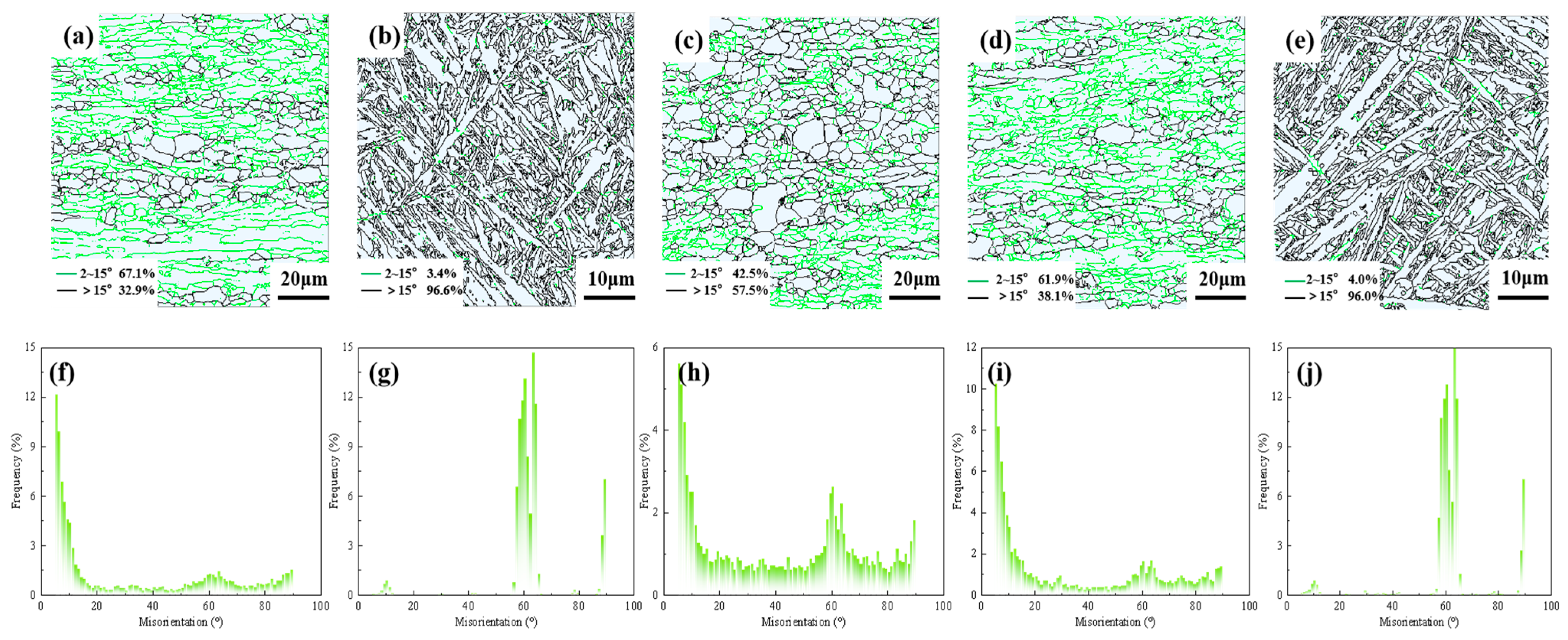 - Beladi, H.; Chao, Q.; Rohrer, G.S. Variant selection and intervariant crystallographic planes distribution in martensite in a Ti–6Al–4V alloy. Acta Mater. 2014, 80, 478–489. [Google Scholar] [CrossRef]