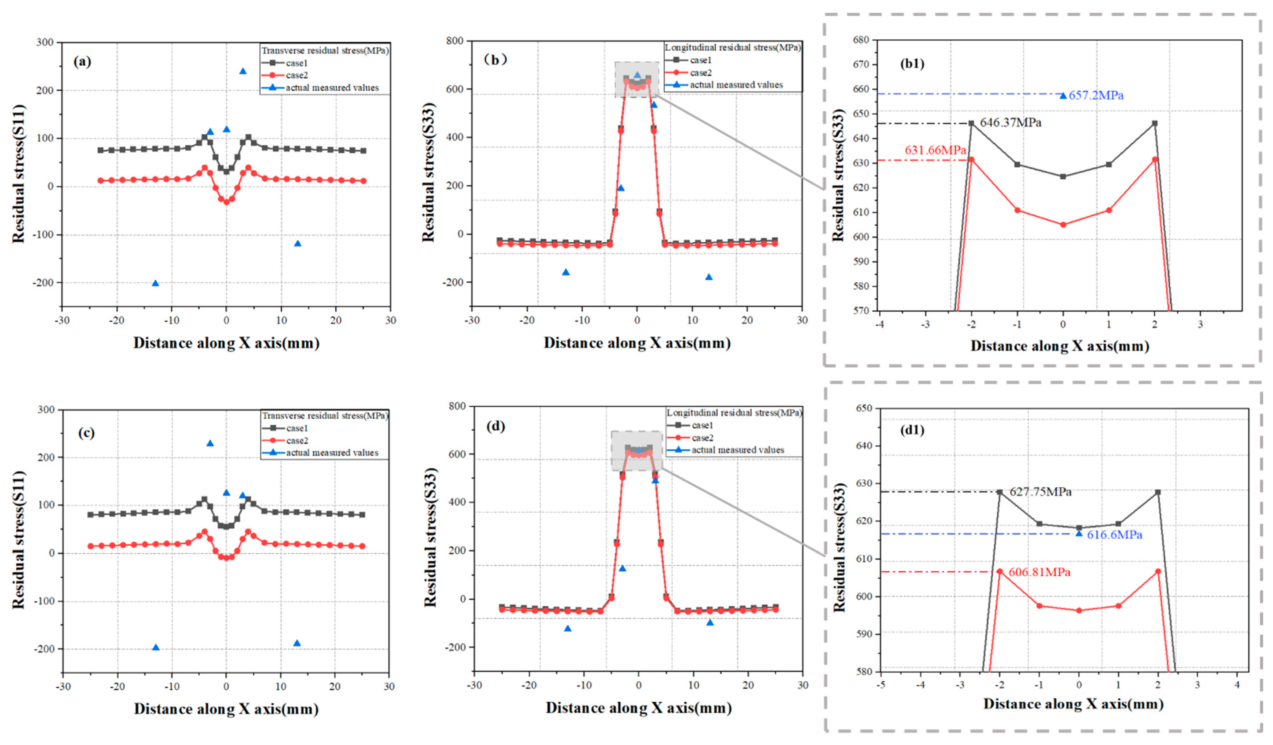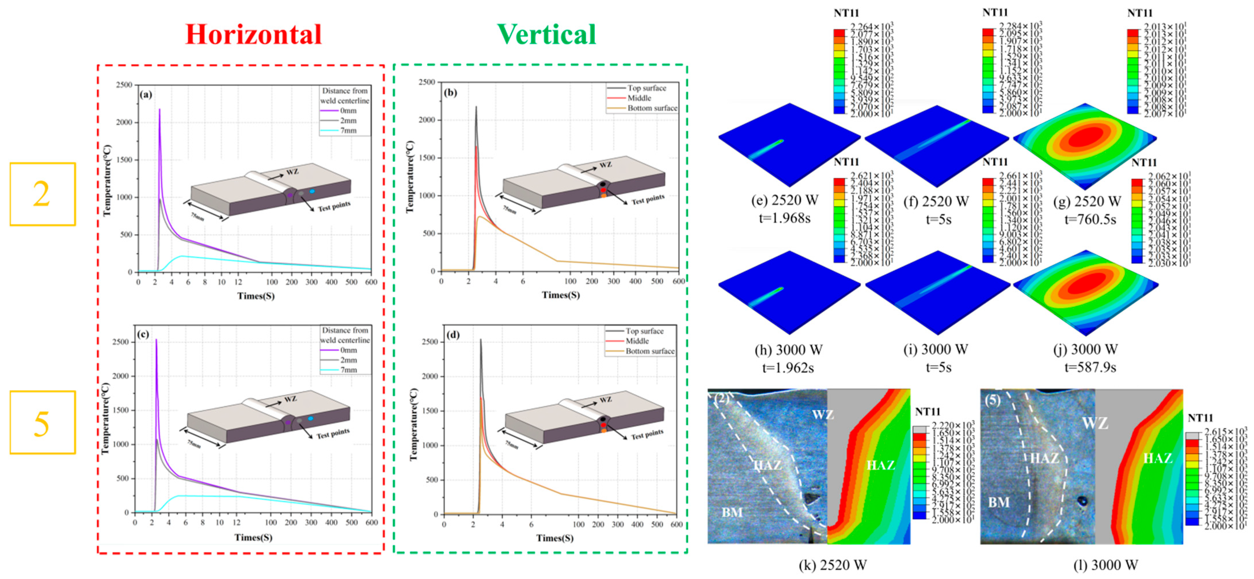 - In the simulation experiment, the simulation outcomes indicated that under the heat source condition of 2520 W, the temperature at the bottom of the plate was too low, resulting in incomplete weld penetration, which was in accordance with the actual experimental circumstances. In the stress field analysis, the errors between the maximum longitudinal residual stress in the WZ obtained through simulation under two different heat source power conditions and the actual measured longitudinal residual stress at the center of the WZ were 1.65% and 1.81%, respectively. The transverse residual stress is more significantly influenced by the clamping configuration and martensitic phase transformation, resulting in relative errors as high as 56.754% and 50.604%, respectively.