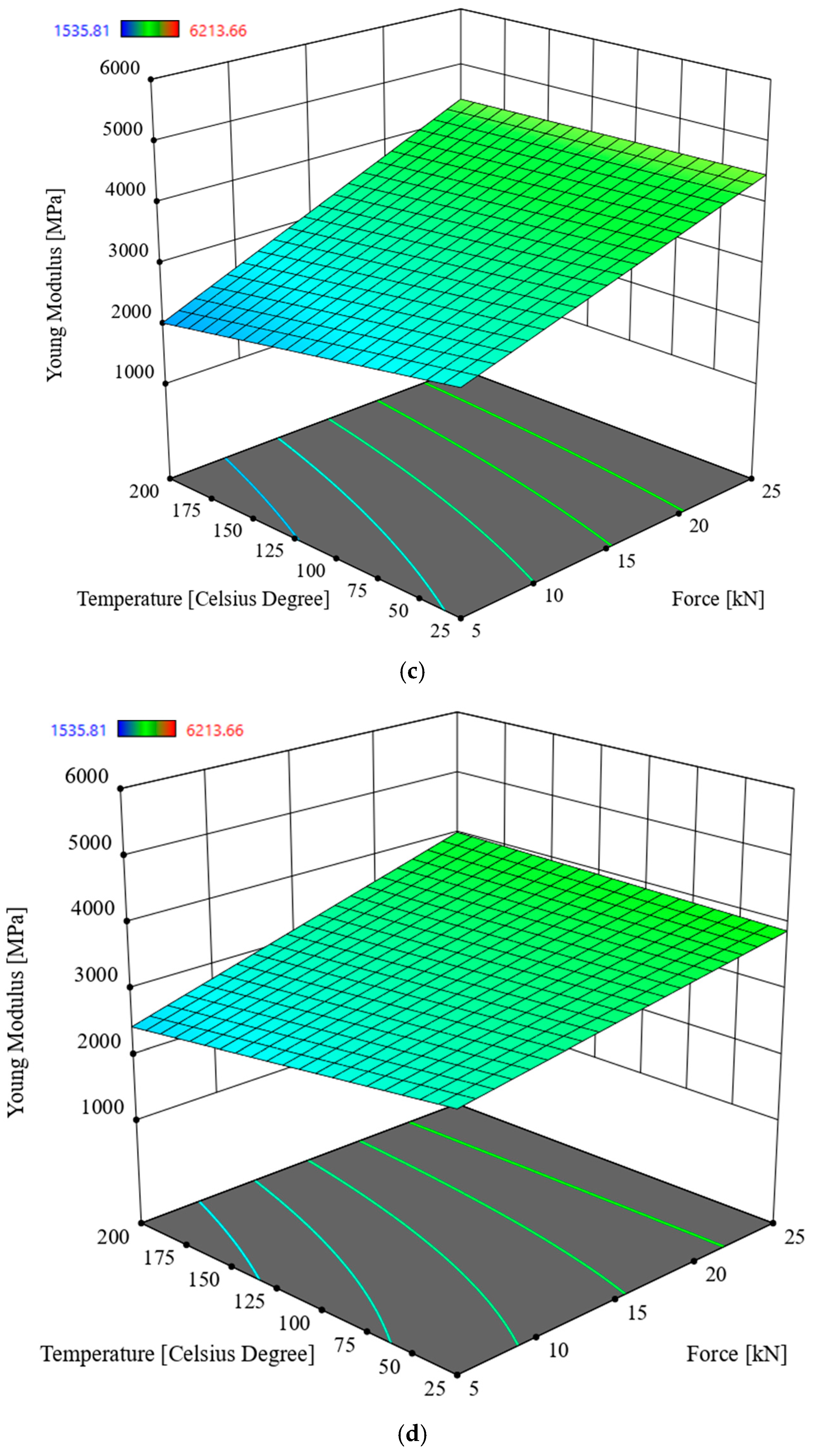 - by foregoing sieving (i.e., further reducing the energy consumption of the process), we can obtain briquettes with a density D approximately 3% lower and a Young’s modulus E approximately 6% higher than that obtained from sawdust fractions with particle sizes S = 2.5–5 mm (this results by optimization was given where F = 5 kN, M = 20%, T = 25 °C, S > 5 mm, D = 840.4 kg/m3, E = 5016.6 MPa).