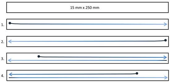 • 1 cm3 of the solution was drawn into a syringe, then 0.5 cm3 was transferred from the syringe into a beaker; approx. half of the solution from the beaker was taken up by the brush and applied along the longer edge of the sample, starting from the left side, with the brush extending 2–3 mm beyond the strip’s edge, ensuring more thorough coverage; with a smooth motion, the solution was applied continuously to the end of the strip; the remaining half of the solution from the beaker was applied to the sample from the opposite side, following the method described above;
