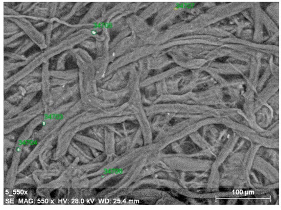 In this study, microscopic analyses indicated that the distribution of magnesium compounds, both on the surface and within the samples, is in line with the results of similar analyses performed on papers deacidified solely with a dispersion of magnesium oxide or magnesium hydroxide [47,48]. In the case of deacidification and subsequent strengthening of model papers with Tylose (Figure 5, examples of quantitative measurement points for magnesium are marked in green), the image of the sample surface reveals small magnesium compound particles, distributed sparsely but in a fairly uniform manner. The amount of magnesium is relatively small (Table 3), as the Tylose solution applied after deacidification most likely covered the agglomerates of magnesium hydroxide nanoparticles deposited during the first stage of the process (deacidifying washing). Furthermore, the image presents the sample surface deacidified at a relatively low dispersion concentration—0.025%. No magnesium compounds were observed under the surface of the sample (after ten cycles of tape peeling from the top fiber layer).
