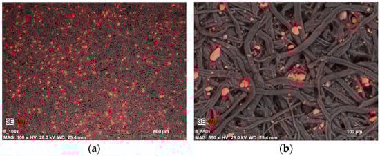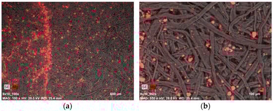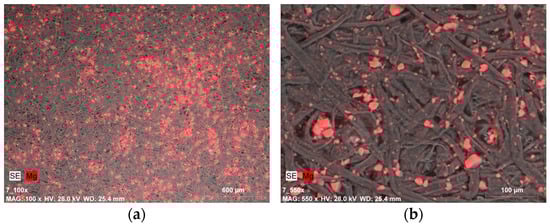 Similar images in terms of magnesium compound distribution and quantity were recorded for samples covered with Klucel G. Most samples exhibited a certain uniformity in magnesium distribution, especially at lower magnifications (Figure 8a), as well as the presence of magnesium compound agglomerates (Figure 8b).