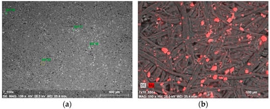 Figure 7. (a) SEM-SE image of deposits on paper surface after deacidifying and strengthening with gelatin and Mg(OH)2 nanoparticles (0.5% Mg(OH)2 dispersion, magnification: ×100); (b) SEM-EDX image of magnesium compound agglomerates on the Whatman paper after deacidifying and strengthening with gelatin and Mg(OH)2 nanoparticles (0.5% Mg(OH)2 dispersion, magnification: ×550)—the image shows the paper sample after peeling off fibers from the surface with the use of adhesive tape.