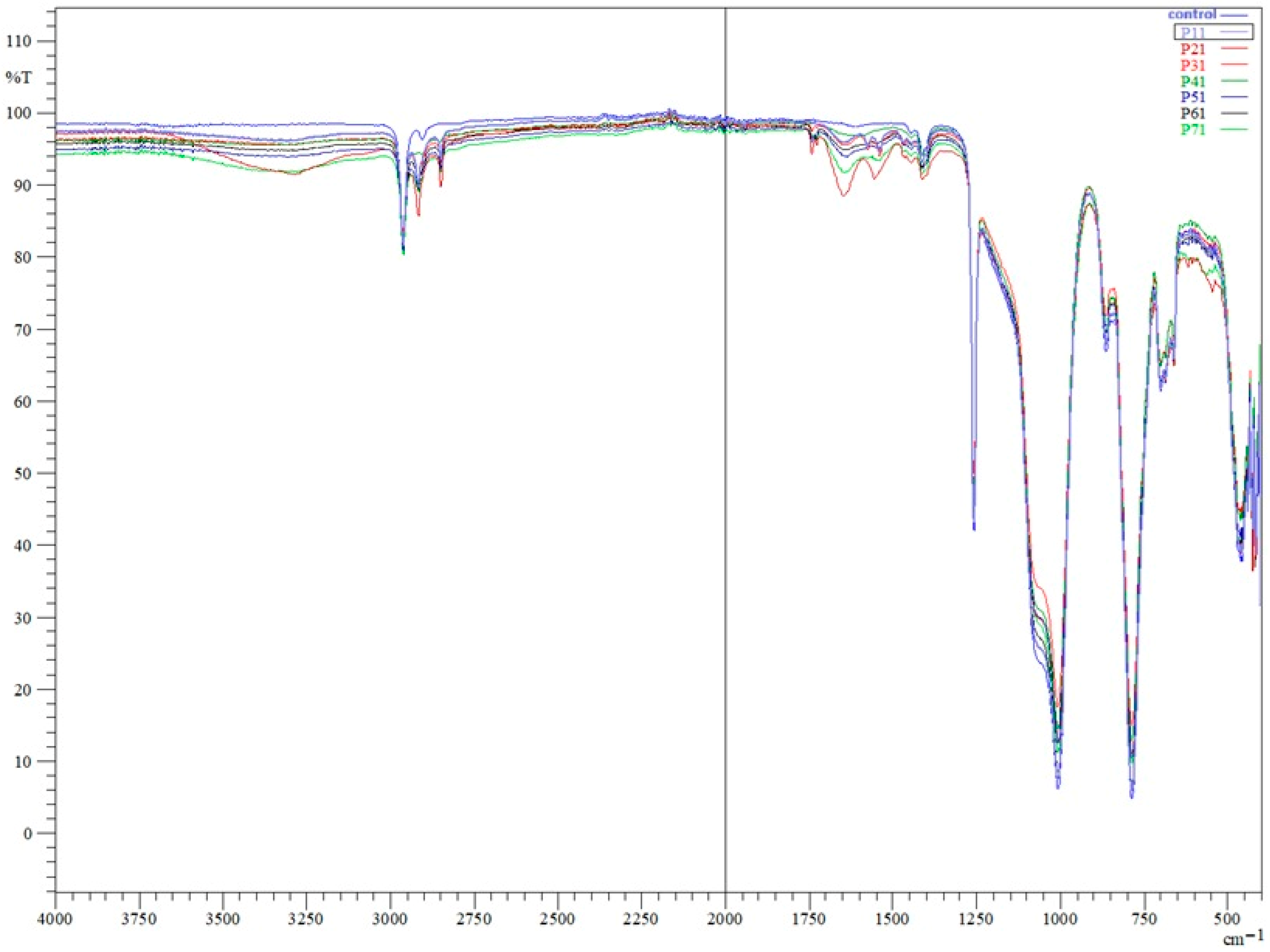 Fourier-transform infrared (FTIR) analysis of the control appliance (P0) and appliances worn for 3 months (P6), 6 months (P3, P4, P5), 12 months (P1, P2), and 24 months (P7) revealed the characteristic absorption profile of polydimethylsiloxane (PDMS). Across all spectra, the main PDMS bands were present: Si–O–Si stretching in the ~1006–1008 cm