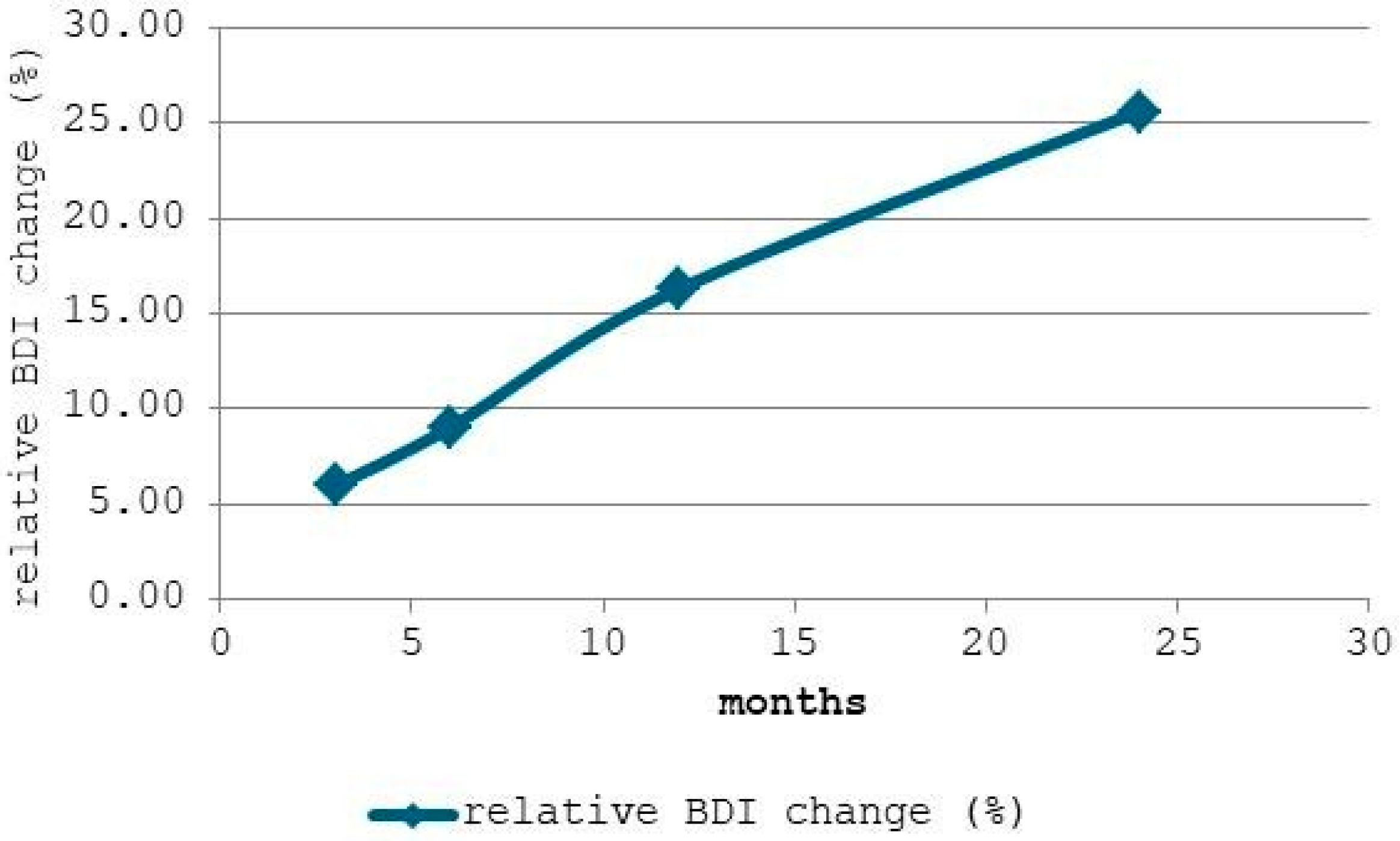Figure 3 displays the relative change in the Backbone Dominance Index (BDI) compared to the baseline (0 months). It can be observed that after 3 months, BDI increased by approximately 5.95%, indicating that crosslinking processes and structural rearrangements in the PDMS network begin relatively early in intraoral service. At 6 months, the relative change reached 9.02%, showing a sustained but moderate progression, while after 12 months, the BDI had increased by 16.38%, suggesting a more pronounced alteration of the siloxane backbone relative to methyl side-groups.
