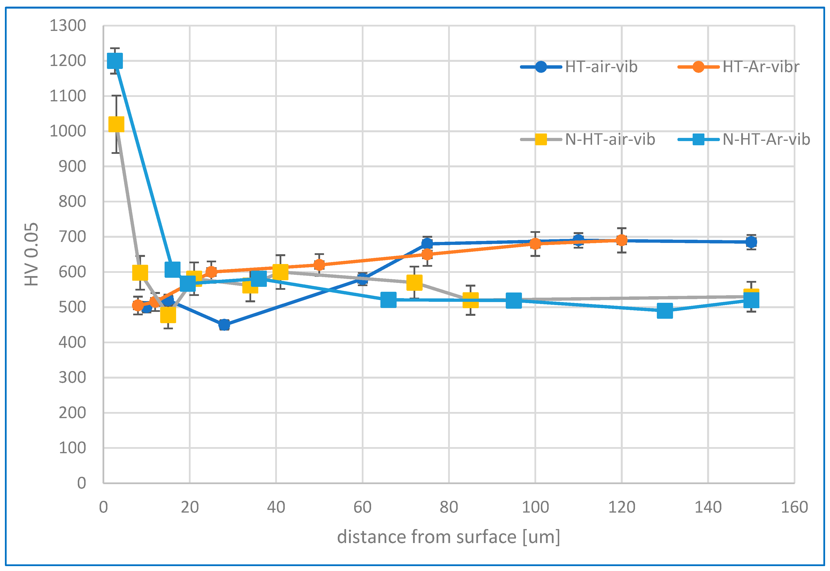 These results suggest that while layer thickness and continuity influence absolute hardness values, the fundamental adhesion mechanisms and failure modes remain consistent across the different processing conditions, with the HT-air treatment providing optimal durability under scratch testing conditions. HT-Ar-vibr.