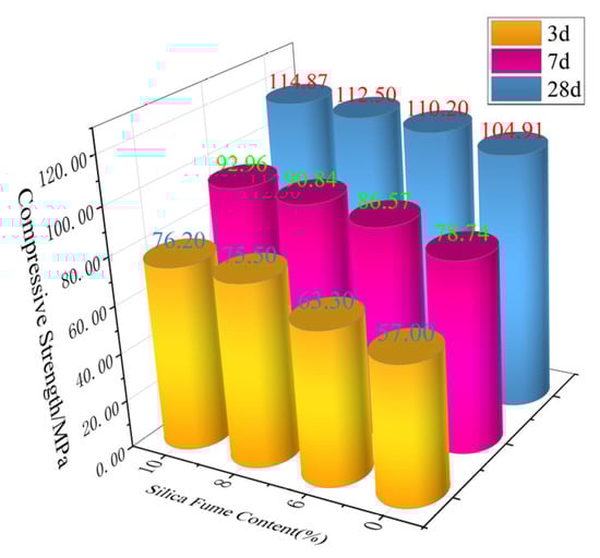 Regarding 3-day compressive strength, SF played a crucial role in early-strength development through its reaction with free Ca(OH)2, which promoted C2S hydration and enhanced early-age strength. As SF content increased from 6% to 10%, the 3-day compressive strength showed an increasing trend. In contrast, GGBS requires an alkaline environment (provided by cement hydration products like Ca(OH)2) for pozzolanic reactions to develop strength. The limited availability of Ca(OH)2 at early ages resulted in reduced early strength, though this negative effect diminished when GGBS content decreased from 24% to 20%.