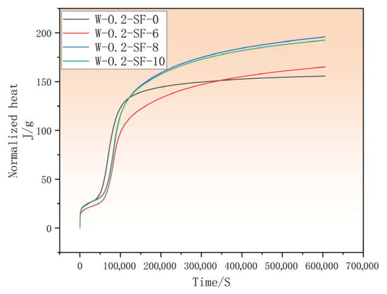 Comprehensively, both SF and GGBS reduced early-age heat release. Comparative analysis indicates that higher GGBS content combined with lower SF dosage effectively suppressed early hydration heat. After the initial period, mixtures with higher SF content reacted earlier, resulting in an accelerated main hydration peak and shorter time to reach the control’s heat level. During the final reaction stage, GGBS contributed to heat reduction, making the 6% SF mixture exhibit the lowest heat among blends, though still higher than the control due to SF’s continuing effect. Furthermore, when SF content reached 8% and 10%, the heat evolution patterns became nearly identical, suggesting a limiting threshold for SF’s influence on hydration heat.