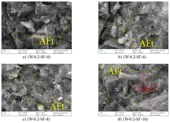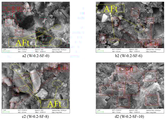Figure 8 further illustrates these microstructural differences: the high-SF mixture (W-0.2-SF-10) displayed substantially more C-S-H gel formation with enhanced fibrous/network-like structures that were more uniformly distributed, consequently creating a denser overall matrix. This phenomenon can be attributed to SF’s high reactivity enabling rapid early-age participation in C-S-H formation, coupled with its particle-packing effect that enhances microstructural density. These microstructural observations provide a fundamental explanation for the compressive strength trend observed in mechanical testing—the increasingly dense and continuous microstructure with higher SF content establishes a solid foundation for strength development.