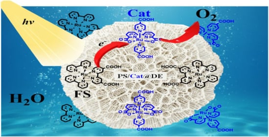 To address these limitations, and to mimic the active site isolation found in natural systems, researchers have focused on immobilization of these ruthenium complexes on solid supports to enhance catalyst stability, facilitate separation, and can improve reaction selectivity. While supports such as synthetic silica [18], zeolites [19], MOFs [20], and graphene [21] have been explored, the selection of Diatomaceous earth (DE) is justified by its unique, naturally hierarchical porous structure. This bio-silica morphology facilitates the required spatial control and physical confinement more effectively than conventional synthetic silica, an approach confirmed by other studies using mesoporous materials to stabilize water oxidation catalysts [22,23], while simultaneously offering a cost-effective and abundant alternative [14,24,25,26]. Diatoms, common single-celled algae found in aquatic environments, contain porous cell walls, known as frustules, which are composed of silica and resemble amorphous silica [24,25,26]. When diatoms die, their frustules accumulate, forming DE, which is a readily available and inexpensive source of highly porous silica with potential for use in advanced materials [27,28,29,30]. The unique structure, transport properties, and biocompatibility of diatoms make them appealing for various uses, including catalysis, sensing, and filtration [27,31]. In the field of artificial photosynthesis, confining the photosensitizer and the catalyst in a limited space—for example, a silica nanocage—is a good strategy to increase the overall efficiency of the process and limit the decomposition of the components [32].
