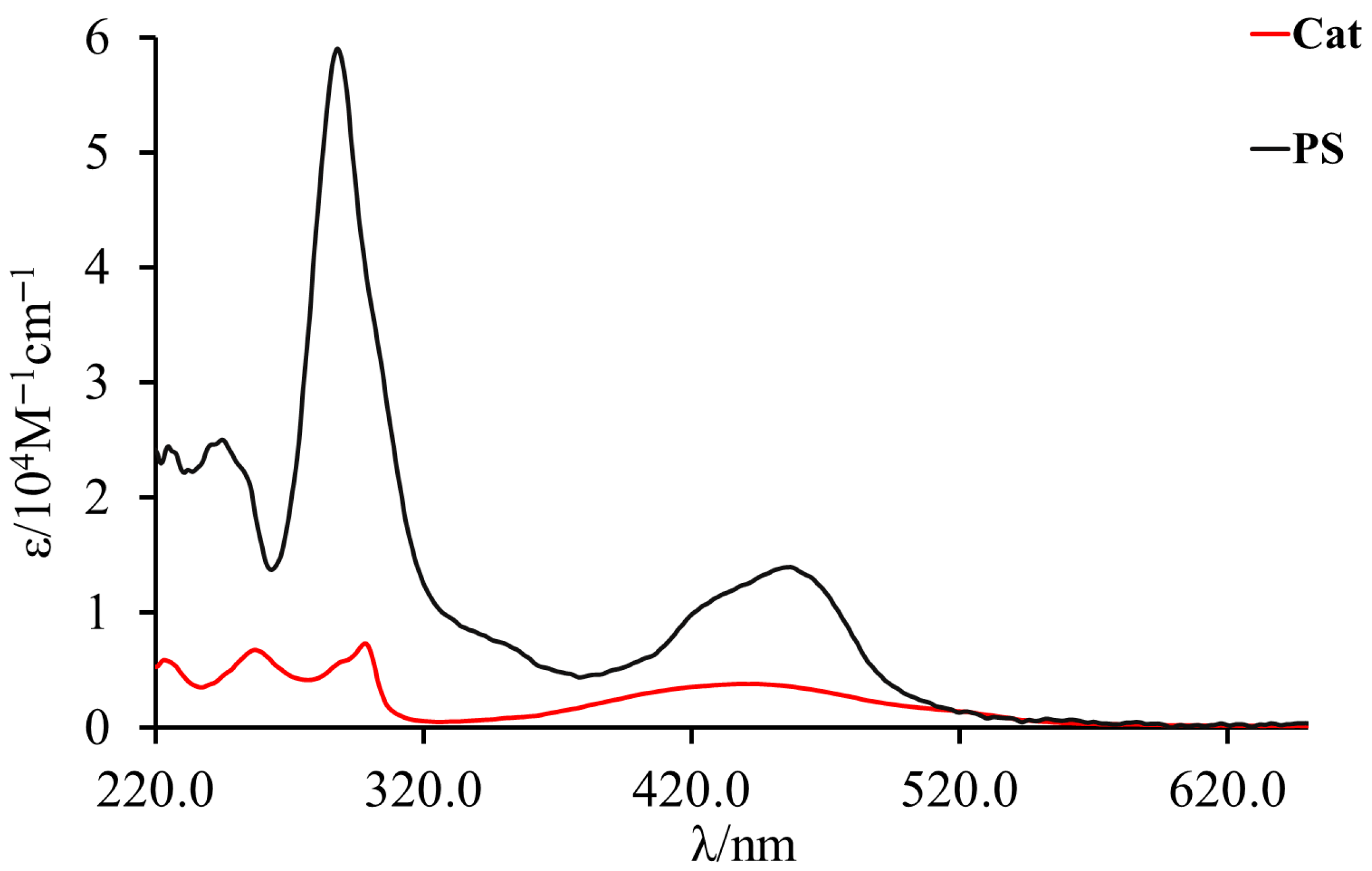 UV-Vis spectra of PS (black line) and Cat (red line) in 20 mM phosphate buffer (pH 7.2). The spectra highlight the intense MLCT transitions in the visible region (~420–450 nm) and ligand-centered transitions in the UV region (~290 nm).