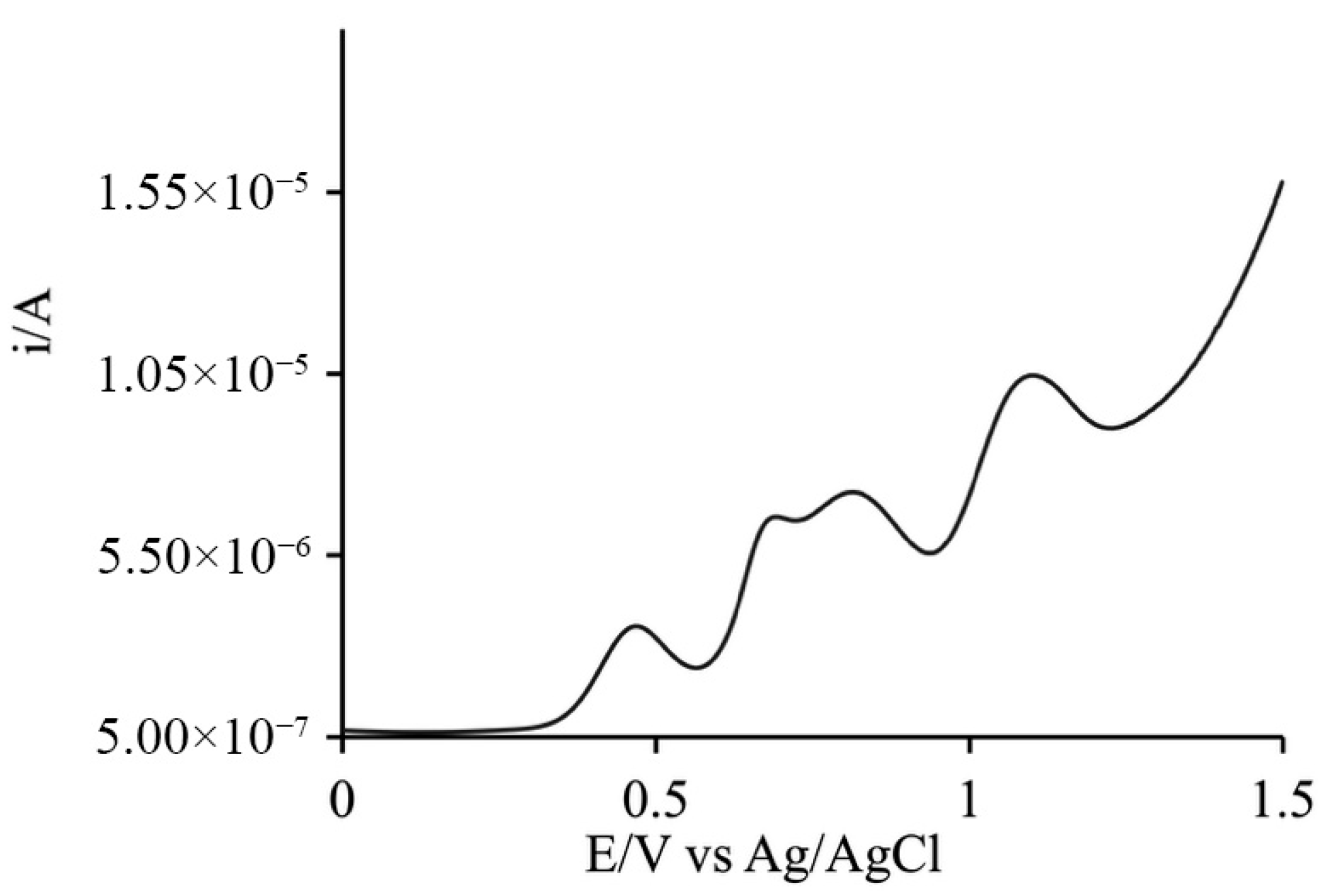 DPV experiment of Cat (2 mM) in 200 mM phosphate buffer, resolving the four sequential oxidation processes at +0.47, +0.69, +0.82, and +1.09 V vs. Ag/AgCl.