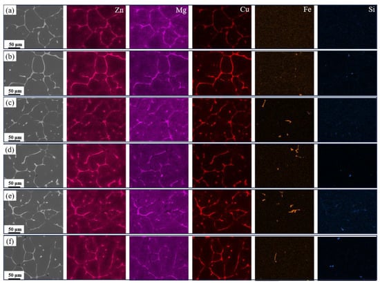 Elemental mapping images of the as-cast alloy: (a) Base alloy; (b) 0.03Fe 0.02Si; (c) 0.15Fe 0.02Si; (d) 0.12Fe 0.08Si; (e) 0.15Fe 0.12Si; (f) 0.03Fe 0.12Si.