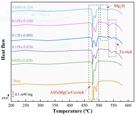 Figure 5 presents the DSC curves of as-cast alloys. Three major categories of endothermic peaks are detected in the alloys. In high Fe-containing alloys, an endothermic peak corresponding to the Fe-rich phase appears near 540 °C, while in high Si-containing alloys, an endothermic peak associated with the Mg2Si phase appears near 520 °C. The 0.15Fe 0.12Si alloy, with higher Fe and Si contents, exhibits significant amounts of both Fe-rich and Mg2Si phases, causing the two endothermic peaks to be essentially combined. All alloys exhibit an endothermic peak for the re-soluble phase between 470 °C and 500 °C. The phase with the lower initial melting temperature is the AlZnMgCu quaternary eutectic phase, while the phase with the higher initial melting temperature is the Cu-rich phase (Al2Cu or Al2CuMg). The DSC curve results are consistent with the previous microstructure results.