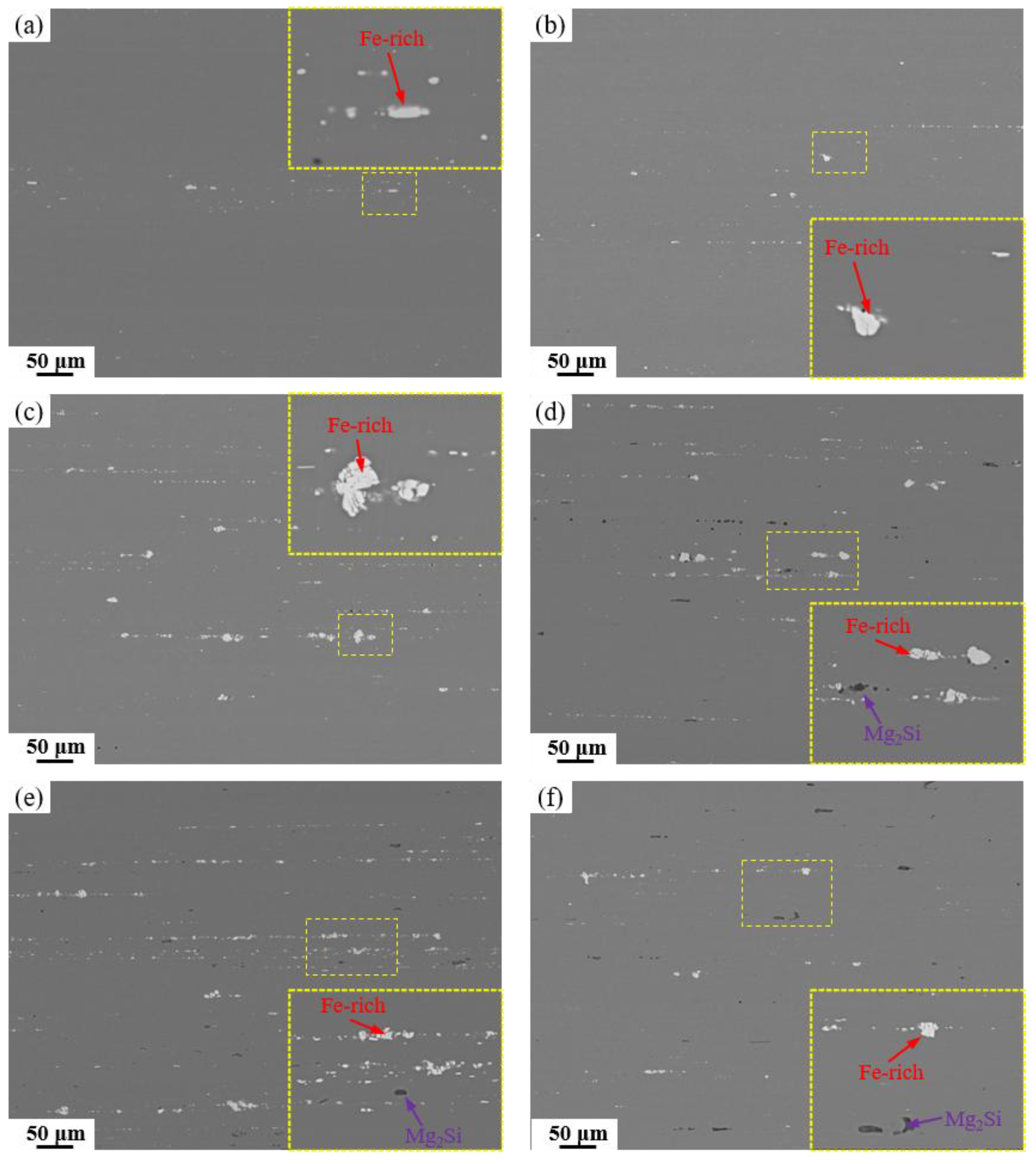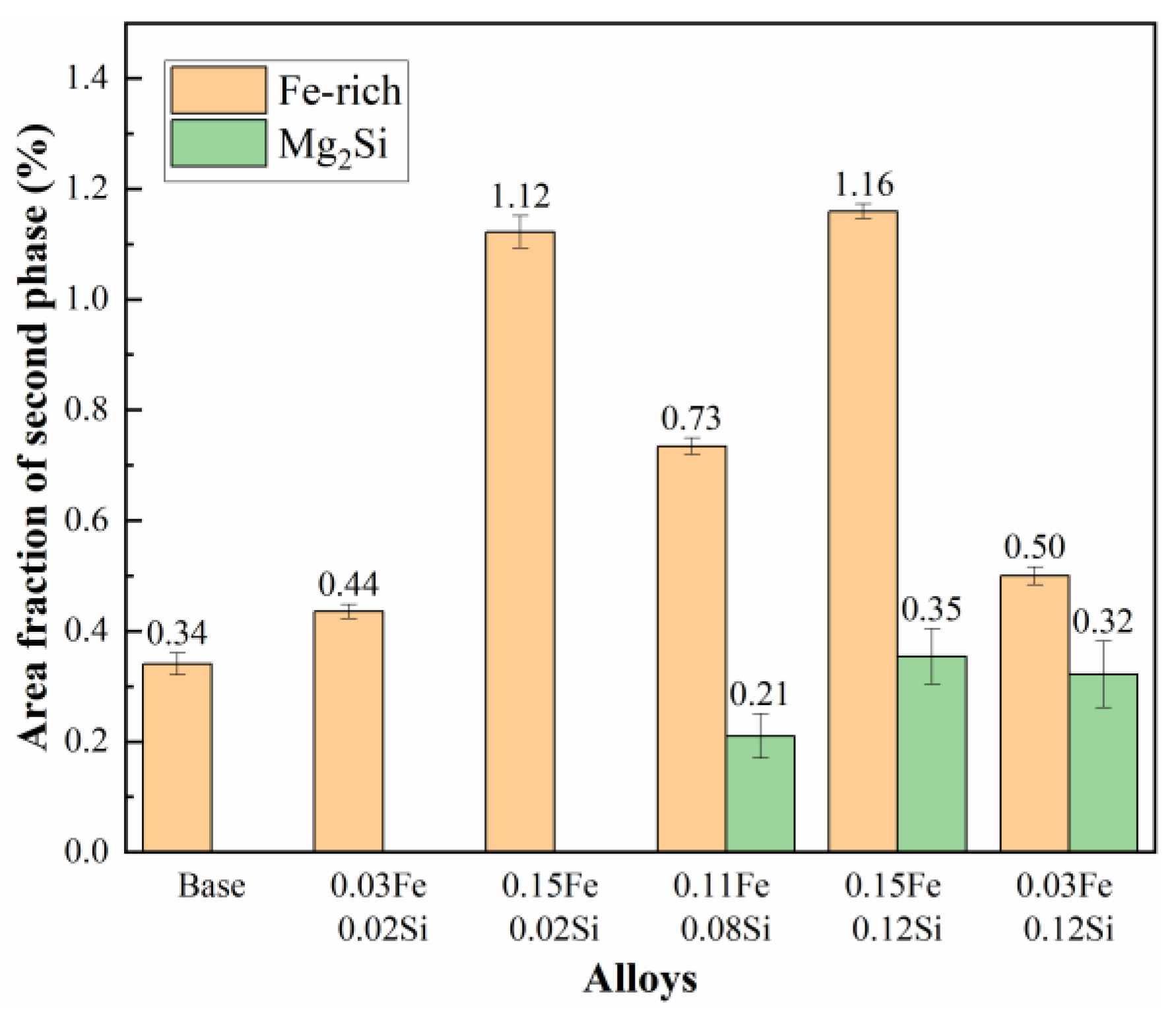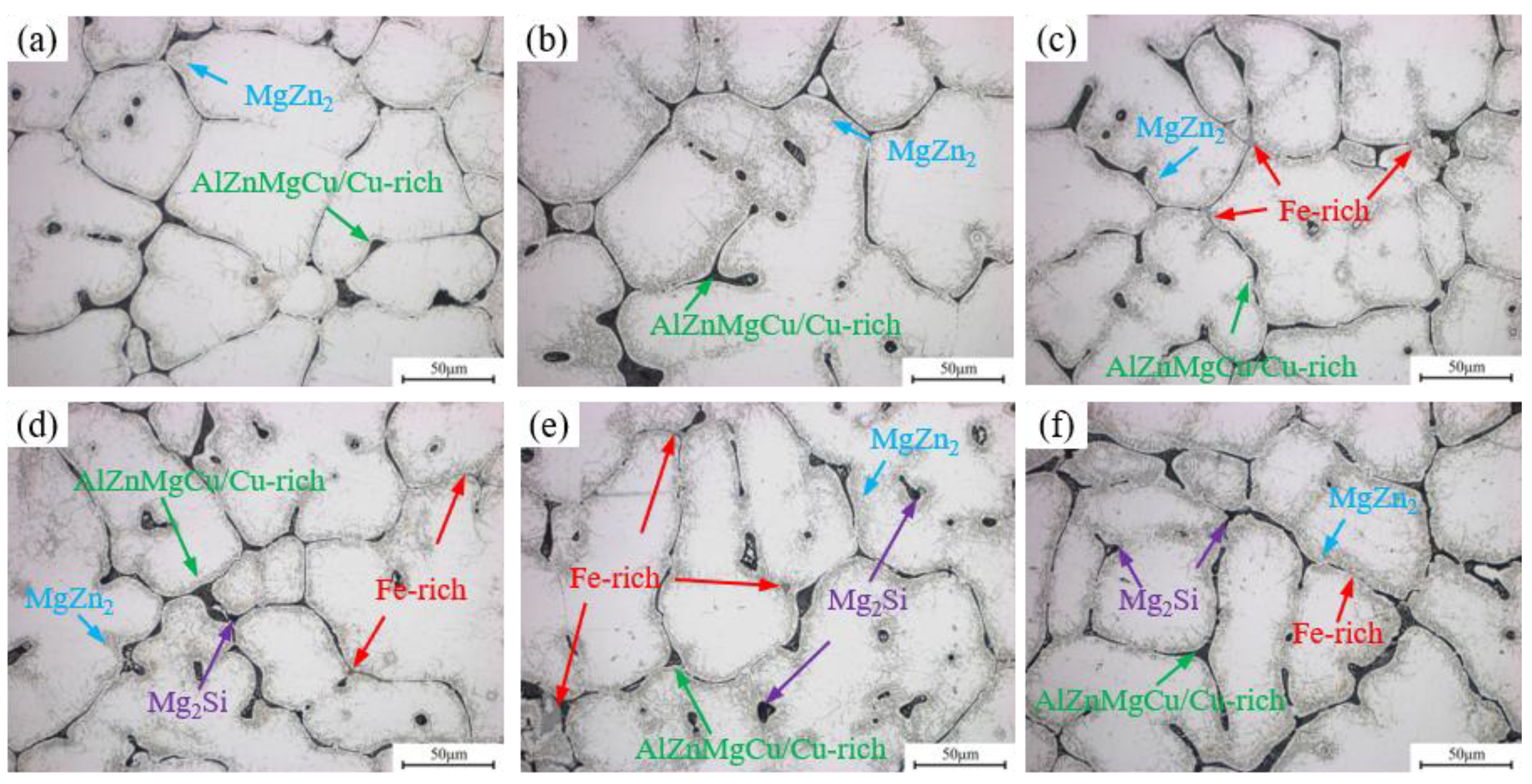 - Impurity elements Fe and Si induce the formation of insoluble Fe-rich phases (e.g., Al7Cu2Fe, Al6Fe, and α-AlFeSi) and Mg2Si phases in the alloy, respectively. These phases persist extensively along grain boundaries after homogenization and solution heat treatments, with their area fractions increasing notably with higher Fe and Si contents.