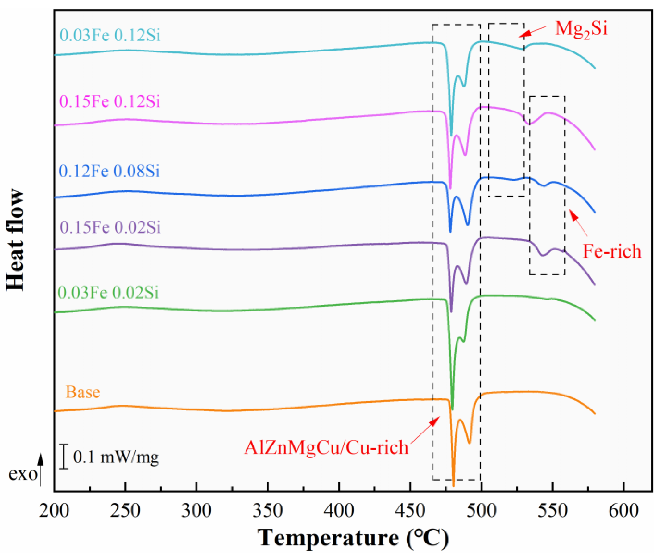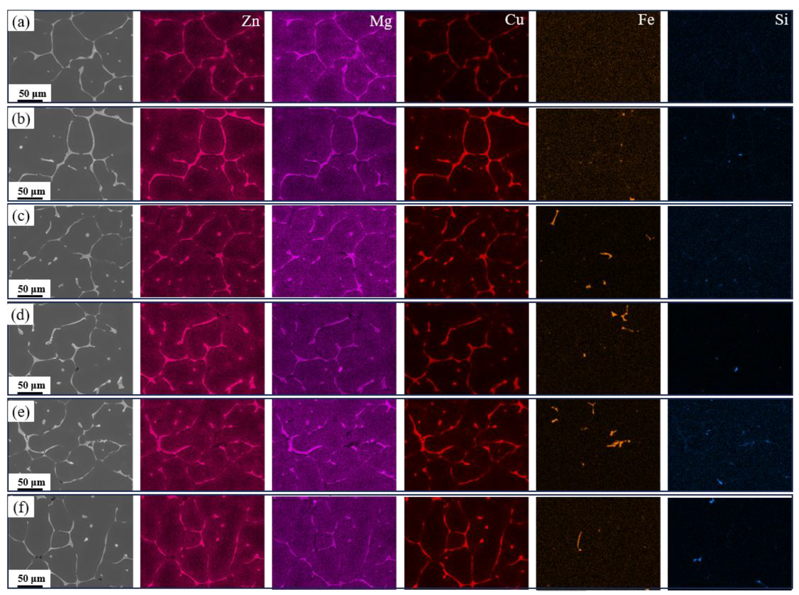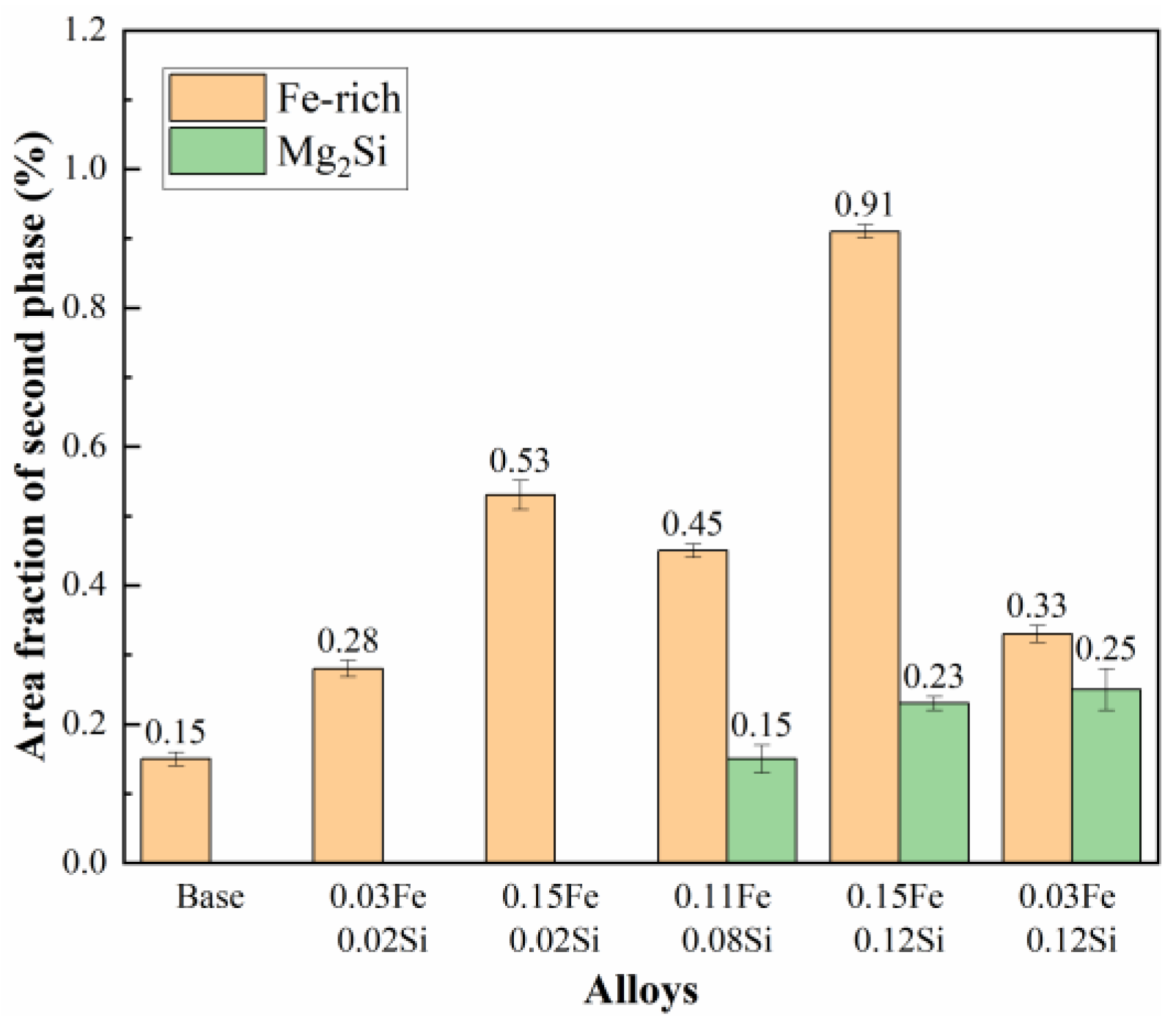 - Impurity elements Fe and Si induce the formation of insoluble Fe-rich phases (e.g., Al7Cu2Fe, Al6Fe, and α-AlFeSi) and Mg2Si phases in the alloy, respectively. These phases persist extensively along grain boundaries after homogenization and solution heat treatments, with their area fractions increasing notably with higher Fe and Si contents.