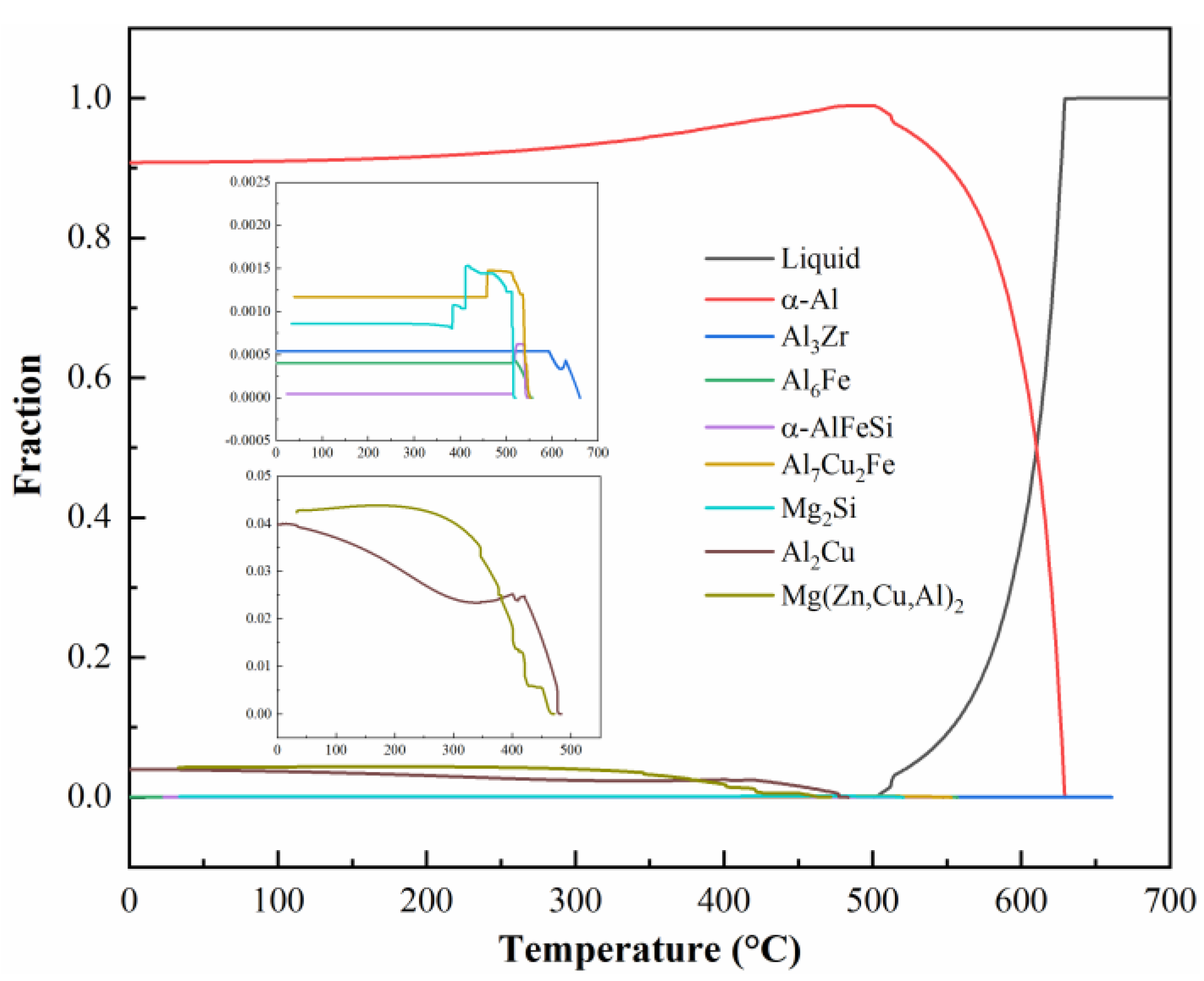 - Yin, H.; Wen, K.; Li, Z. Effect of Zn/Mg Ratio on the Microstructure and Mechanical Properties of As-Cast Al-Zn-Mg-Cu Alloys and the Phase Transformation During Homogenization. J. Mater. Res. Technol. 2023, 26, 3646–3660. [Google Scholar] [CrossRef]