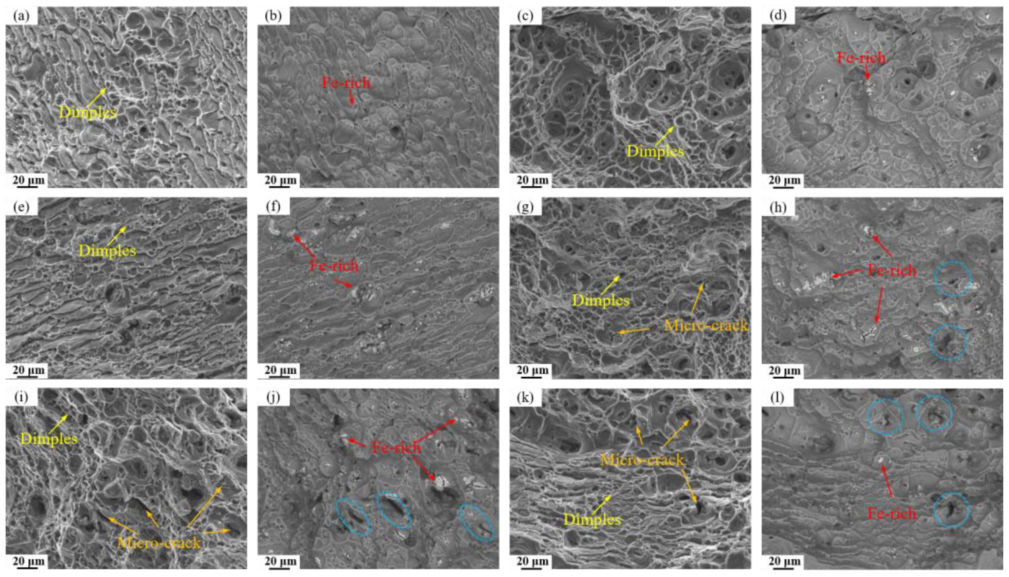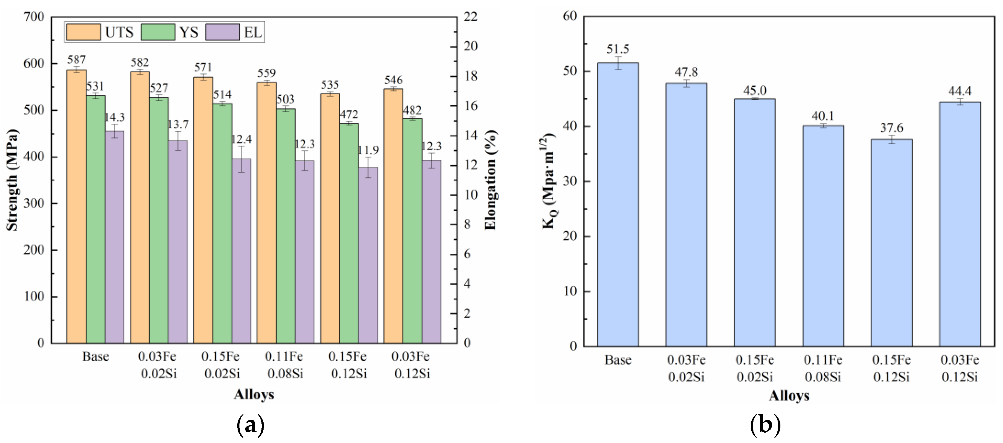 - The concurrent addition of Fe and Si results in a severe synergistic deterioration of mechanical properties. The most pronounced degradation occurs at 0.15 wt.% Fe and 0.12 wt.% Si, where the alloy exhibits a tensile strength reduction of 52 MPa, a loss of 2.4% in elongation, and a drastic decrease of 13.9 MPa·m1/2 in fracture toughness relative to the base alloy.