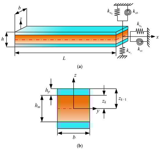 As illustrated in Figure 1, the sandwich laminated beam comprises two layers of piezoelectric sheets and a base layer. The length of the beam is L, the thickness of the upper and lower piezoelectric layers is hp, and the thickness of the middle substrate layer is hm. Five sets of springs are installed on the end faces of the beam in order to accurately simulate various mechanical boundary conditions. In this configuration, denote the spring stiffness in the x and z directions, while represent the rotation spring stiffness. Moreover, consideration is given to one particular set of constraints, kΦ, which is associated with electric displacement. The piezoelectric term is incorporated in the derivation of the subsequent equations, and the base layer can be adjusted arbitrarily according to the actual situation.