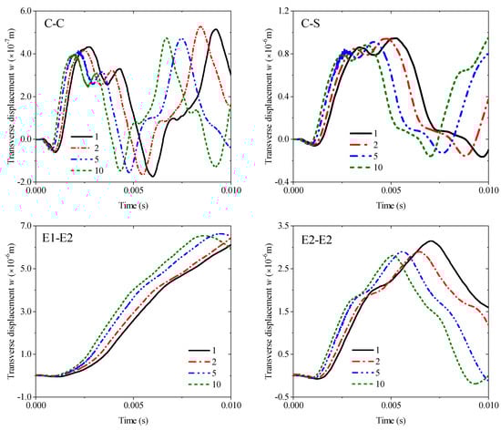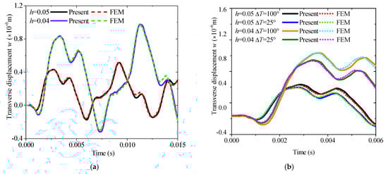 According to the overall Equation (85), MRRM is also suitable for analyzing the transient response according to the wave source vector s. The time t is set as 15 ms, the incremental step is 1000, a unit step loading applied in the z direction acts at L/4, and the observation point is set at 3L/4 to show the excitation response more clearly and accurately. Herein, the length of the beam is specified as 1 m, with the overall thicknesses set to 0.04 m and 0.05 m, respectively, and the thickness of each layer is assumed to be equal. Clamped–clamped (C-C) boundary conditions are uniformly adopted to ensure the activation of thermal stress, and the applied thermal environments are uniform thermal fields at 25 °C and 100 °C. In the finite element simulation, the pre-stress inside the structure under different temperature rises is first calculated and stored in the previous analysis step, and then the subsequent transient thermal vibration response is derived based on this pre-stress. The response curves and FEM results under different slenderness ratios are shown in Figure 3a. The thermal transient responses under ∆T = 25 °C and ∆T = 100 °C are also compared in Figure 3b, and they are in good agreement with FEM results.