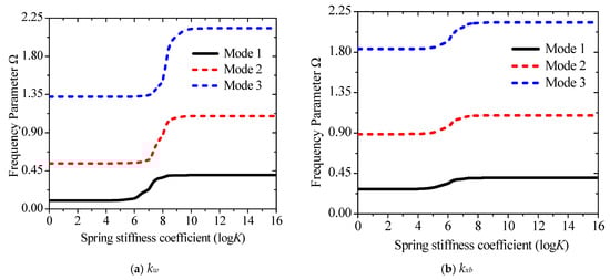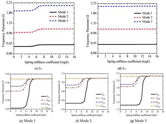 The advantage of using springs to simulate boundary forces is that they can break away from the limitations of classical boundary conditions and obtain results closer to those in actual engineering. The effect of the change of the stiffness coefficient of each spring on the frequency parameters is studied separately to better express the numerical results. The stiffness matrices are {ku0, 1018, 1018, 1018, 1018}, {1018, kw0, 1018, 1018, 1018}, {1018, 1018, kxb, 1018, 1018}, {1018, 1018, 1018, kxs, 1018}, and {1018, 1018, 1018, 1018, kwz}. The stiffness coefficients represented by {ku0, kw0, kxb, kxs, kwz} increase from 0 to 1018. Since the frequency of each order corresponding to ku0 does not change, the changing law of {kw0, kxb, kxs, kwz} is shown in Figure 4a–d. Evidently, Figure 4a–d illustrate that the influence of boundary spring stiffness on each order of natural frequency is concentrated within the range of 104–108. Since kxb is expressed as a function of w0, and kxs is defined as the rotational component of the beam, both exhibit a similar sensitivity range with respect to the out-of-plane vibration of the beam. It is noteworthy that the spring stiffness corresponding to the thickness stretching degree of freedom wz, which is associated with the Poisson effect, does not exhibit frequency sensitivity and exerts no influence on the system frequency. When the spring stiffness is below or above this range, the structure degenerates into free and fixed boundary conditions, respectively. In addition, Figure 4e–g compare the first three orders of natural frequency values induced by variations in each spring stiffness, which clearly demonstrates the variation range and sensitivity of the system frequency when the spring stiffnesses corresponding to w0,, and change. Obviously, the main change interval of the frequency is concentrated between 105–1010, and the corresponding spring stiffness coefficient gradually increases with the rise in the order. Figure 4e–g also show that the change in kw has a more obvious influence on the frequency than kxb and kxs, while kwz is nearly very weak.