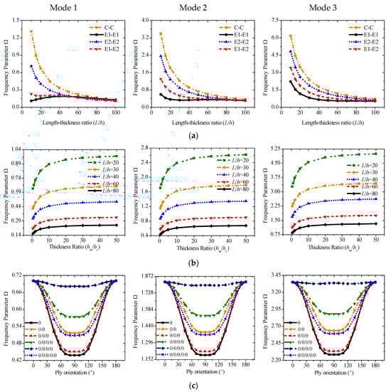 Variations of the frequency parameter Ω versus boundary conditions and elastic modulus for a sandwich laminated beam (PZT-5A/Material-A/PZT-5A, L = 1 m, h = 0.03 m): (a) Mode 1; (b) Mode 2; (c) Mode 3.