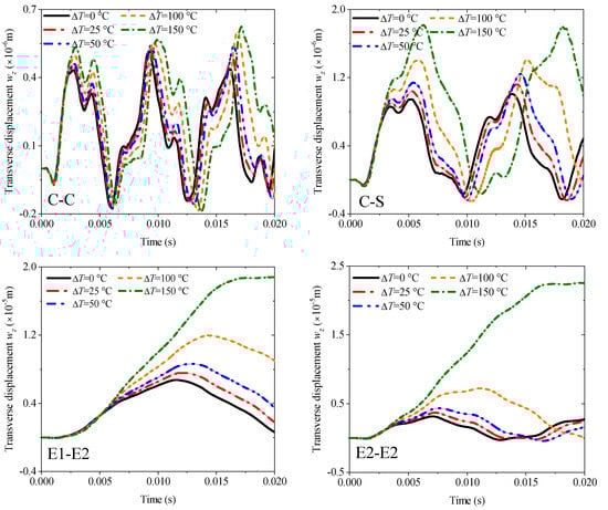 Comparison of the transient transverse displacement responses with different thickness h and temperature rises ∆T (L = 1 m, C-C): (a) different thickness ratios; (b) different temperature rise.
