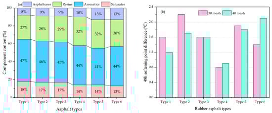 Asphalt composition and softening point difference: (a) Chemical composition test; (b) Softening point difference (based on [21]).
