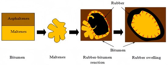 Due to the complex composition of rubber powder and asphalt, and the complex physical and chemical reactions between their components, the interaction mechanism between rubber powder and asphalt during the mixing process is complex. Based on domestic and international research on rubber asphalt, the mechanism of interaction between rubber powder and asphalt can be summarized as follows [25,26,27].