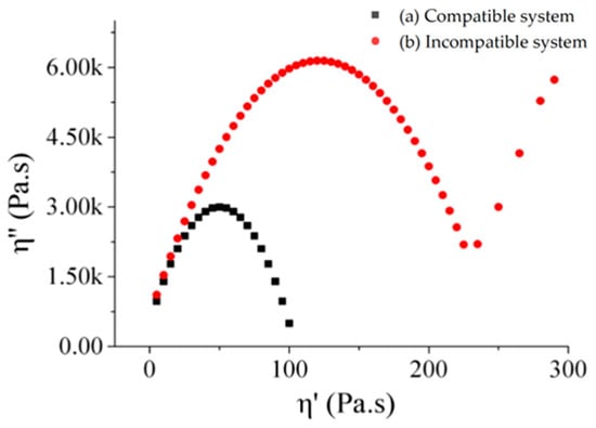 The Cole-Cole plot is a curve composed of the real part (η′) and imaginary part (η″) of the dynamic complex viscosity measured by frequency sweep testing. Utracki’s research found that, compared to viscosity curves, Cole–Cole curves are more sensitive to phase separation and can provide relevant information about relaxation mechanisms [36]. Yvonne pointed out that Cole-Cole plots can be used to evaluate the compatibility between polymers and asphalt [37]. As shown in Figure 4, when the polymer-asphalt blend system is below the phase separation temperature, it exhibits a single arc curve (Figure 4—a). This curve indicates that only one relaxation mechanism exists in the mixed system, which also demonstrates the good compatibility between the polymer and asphalt [38]. However, when the phases separate, two peaks appear in the Cole-Cole plot (Figure 4—b). These two peaks represent two different substances, and as the temperature rises, the curves will no longer remain semicircular arcs. Therefore, the peaks of the curves in the Cole-Cole plot can be used to evaluate the compatibility between polymers and asphalt. At the same time, the potential tendency for polymers to separate from asphalt is characterized by whether the curve deviates from the semicircular arc [39].