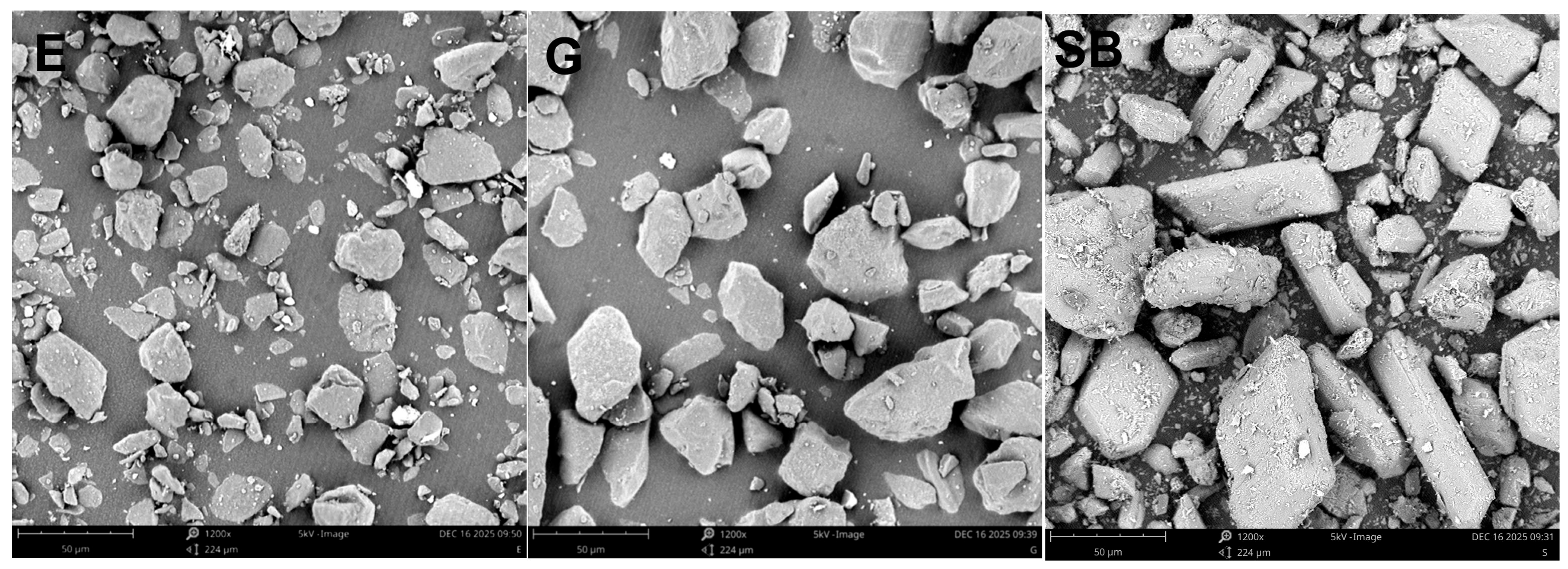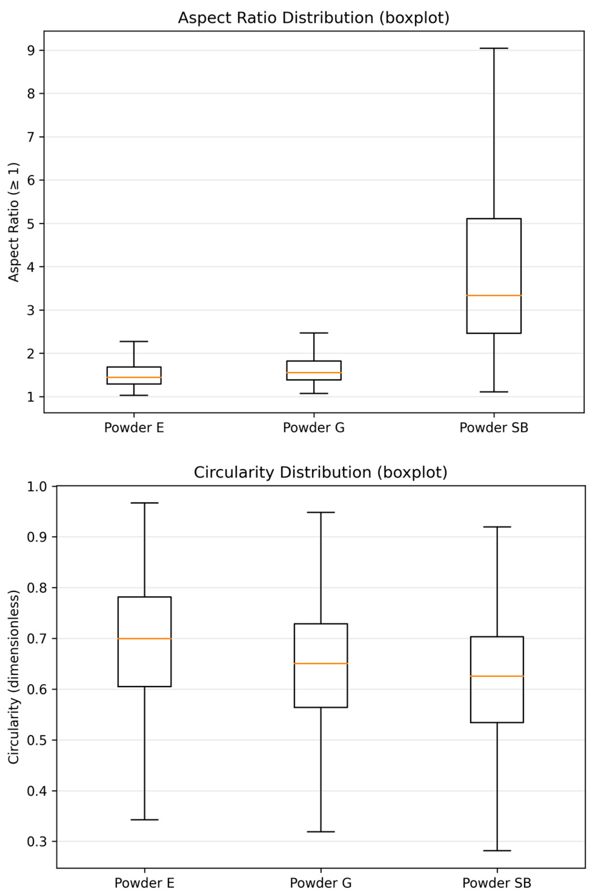 | Powder | N | ECD Mean ± SD (µm) | ECD Min–Max (µm) | ECD D10/D50/D90 (µm) | Aspect Ratio Median [Q1–Q3] | Circularity Median [Q1–Q3] | Circularity Min–Max |