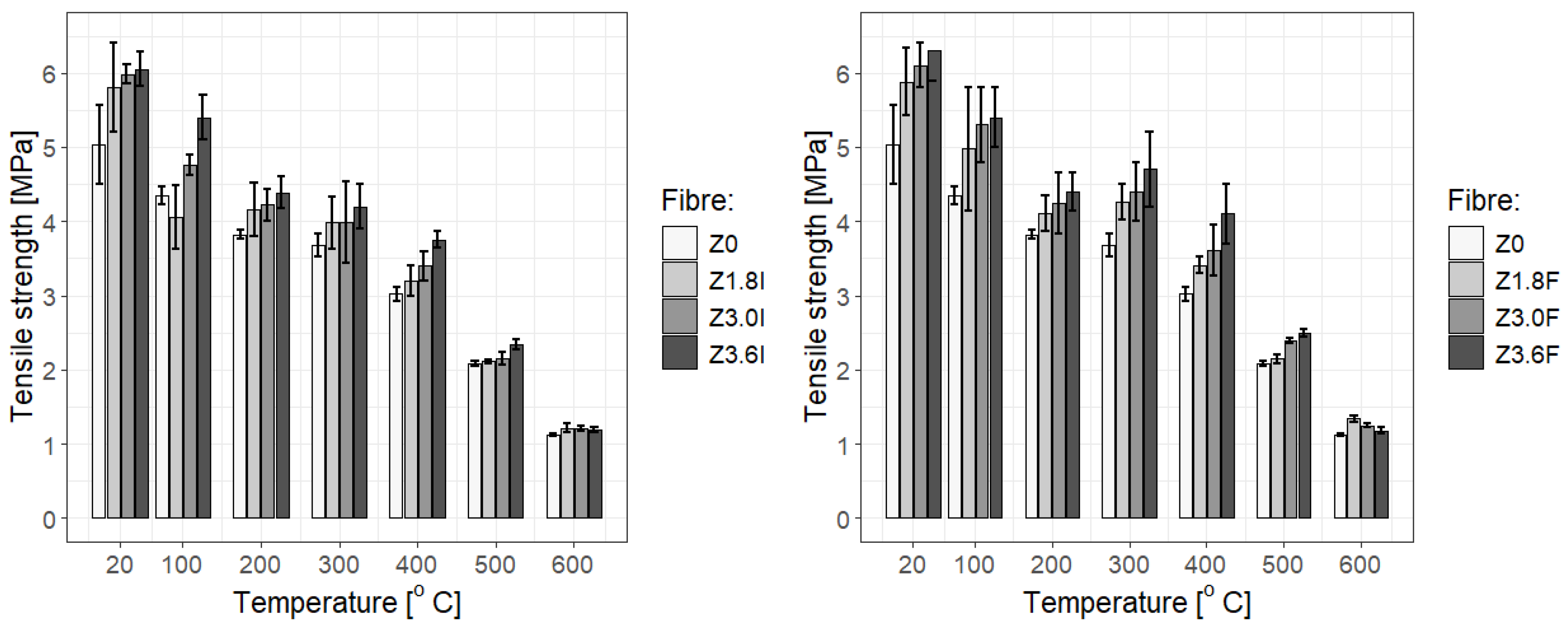 - To some extent, the addition of fibres improves the mechanical properties of the mortar; however, above 500 °C all the specimens behave similarly, exhibiting a significant reduction in tensile strength (even more than five-fold). Nevertheless, within the margin of uncertainty, the strength of the specimens with added fibres is higher, although only by 5–7% for type I fibres and 5–10% for type F fibres at dosages of 3.6 kg/m3 and 3.0 kg/m3, or even up to 19% for type F fibres at a dosage of 1.8 kg/m3.